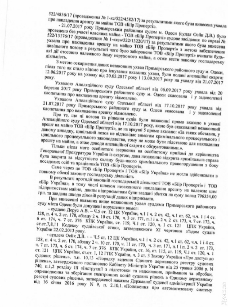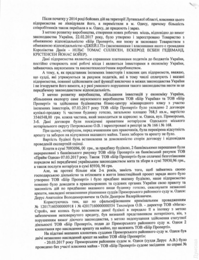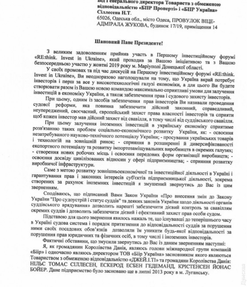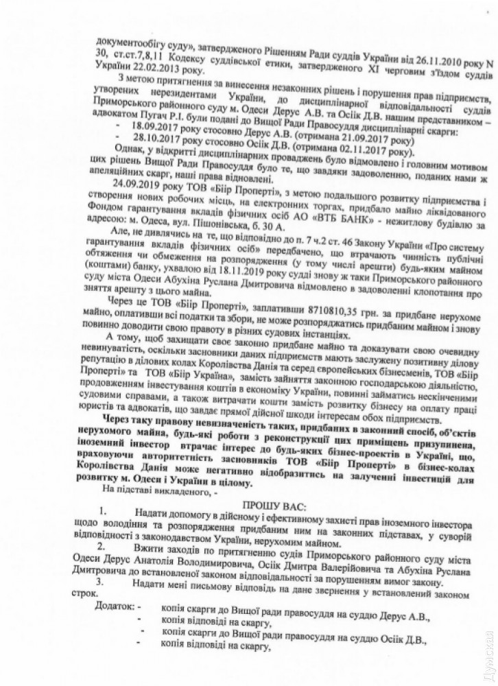 Датская инженерная компания просит у президента защиты от произвола одесских рейдеров и судейДатская инженерная компания «BIIR Украина», занимающаяся проектированием, дизайном и расчетом возобновляемых источников энергии, у которой есть офис в Одессе, обратилась к президенту Украины Владимиру Зеленскому с просьбой защитить их инвестиции от постоянных атак рейдеров и нечестных судей. Датчане столкнулись в Одессе с небывалым жульничеством, в котором, по мнению руководства компании, замешаны и судьи Приморского суда. Напомним, «Думская» писала, что до 2014 года украинский офис компании находился в Луганске, но с началом российско-украинской войны, когда в офис ворвались вооруженные боевики и начали забрасывать здание коктейлями Молотова, «BIIR Украина» вынуждена была искать другое место дислокации. С 8 человек в 2013 компания выросла до 200 в 2019, открыв офисы в Киеве, Харькове, Львове и Одессе. В итоге купили за 400 тысяч долларов офис на Приморской, 3б. А через месяц после сделки его отсудила фирма, которая более шести лет не выплачивала кредит. Речь о компании «Мегас-Строй», конечным бенефициаром которой является экс-депутат Одесского горсовета от Партии регионов Валентин Скобленко. Позже «Мегас-Строй» обратилось в Приморский суд с ходатайствами о наложении ареста на проданное здание и 23.03.2017 года судья Приморского районного суда Одессы Анатолий Дерус удовлетворил ходатайство «Мегас-Строй». Второе ходатайство поступило 21.07.2017 года от все той же «Месас-Строй» о запрете осуществлять любые действия со зданием удовлетворил судья Приморского суда Дмитрий Осиик. В свою очередь «BIIR Украина» обжаловала данные решения в апелляционном суде, который отменил решения Приморского суда. Однако из-за судебной волокиты и незаконного уголовного производства компания понесла убытки в размере почти 8 миллионов гривен. Датчане обратились в Высший совет правосудия о привлечении к дисциплинарной ответственности судей Приморского суда Деруса и Осиика, но там им отказали. Уже в этом году с целью расширения «BIIR Украина» приняла участие в электронных торгах и приобрела имущество ликвидированного Фондом гарантирования вкладов физических лиц АО «ВТБ БАНК» нежилое здание по адресу Пишоновская, 30а, заплатив за него 87 миллионов 710 тысяч гривен. После этой сделки компания обратилась в Приморский суд с ходатайством о снятии ареста с выкупленного здания (это предусмотрено п. 7 ч.2 ст. 46 Закона Украины «О системе гарантирования вкладов физических лиц», — ред.), однако судья Руслан Абухин не удовлетворил законное требование инвестора. Выходит, что уже во второй раз датская компания вынуждена доказывать свою правоту в высших судебных инстанциях. В связи с этим генеральный директор ООО «Биир Проперти» Томас Силлесен обратился к президенту Украины Владимиру Зеленскому с просьбой о защите иностранного инвестора и привлечению к ответственности судей Приморского суда Одессы, которые выносили неправомерные решения – Анатолия Деруса, Дмитрия Осиика и Руслана Абухина. «С препятствиями, с которыми столкнулись мы, сталкиваются так же и другие украинские компании. Есть честные профессиональные судьи, а есть и не очень. Теперь мы обратились напрямую к президенту Зеленскому. Если это не поможет, мы просто снова будем жаловаться в следующий раз, когда Украина получит
