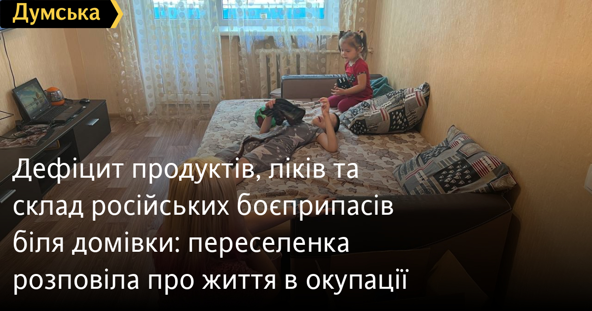 Дефіцит продуктів, ліків та склад російських боєприпасів біля домівки: переселенка розповіла про життя в окупаціїКореспондент «Думської» познайомилася із родиною Борисюків, яка майже п'ять місяців жила в окупації на Херсонщині. Нову Каховку російська армія захопила першого ж дня повномасштабного вторгнення — 24 лютого. Все сталося швидше, ніж місцеві жителі встигли зрозуміти, що почалася війна. «Ми прокинулися від вибуху. Я глянула у вікно і побачила червоний гриб, щось дуже сильно горіло. Почала телефонувати у швидку та пожежну, але там було зайнято. Пізніше ми дізналися, що це ракета влучила у військову частину. Ми довго не могли зрозуміти, що відбувається. Потім побачили, десь об 11-й годині, що на будівлі адміністрації зняли прапор України і підняли російський. Нас окупували. Як все могло статися так швидко? О п'ятій ранку почалася війна, а об 11 вони вже нас захопили?» — задається риторичними питаннями Анастасія Борисюк. Вона згадує, що російські військові одразу розпочали «зачистку» населення. Шукали колишніх бійців АТО, волонтерів, активістів та всіх, хто відкрито виявляв свою проукраїнську позицію. Затриманих відвозили у підвали та катували. Люди були настільки налякані, що боялися навіть вийти на вулицю. «Боїшся, тому що якщо ти навіть затримаєш свій погляд на комусь із солдатів – будуть підозри, що ти щось знаєш і тебе потрібно допитати та забрати «на підвал». Вони ходили, шукали сім'ї учасників АТО, квартирами ходили. Когось ламають, катують. Хтось розповідає адреси та імена. Це було спочатку. А потім уже почали чіплятися до всіх. Ти волонтер – пішли поговоримо «на підвал», ти журналіст, і у Фейсбуці вжив слово «орк» – ходімо поговоримо», – продовжує розповідь Настя. За кілька місяців армія окупантів перетворила життя мирних мешканців на справжнє пекло: «Почався масштабний дефіцит, дефіцит медикаментів, дефіцит готівки, бо немає її у банкоматах. Немає зв'язку ніякого, неможливо ніяк перевести в готівку гроші. Ті, хто їх переводить, вимагають відсоток. Спочатку брали 2%, потім почали брати 25%. Тобто, щоб перевести в готівку 1000 гривень, потрібно заплатити 250». Останні тижні стали ще напруженішими. Українські військові почали знищувати склади з боєприпасами, які окупанти облаштовували поряд із житловими будинками. Під час одного з обстрілів у квартирі родини Борисюків вилетіли вікна та двері. Дивом ніхто не постраждав. «Склад був на Букіна, 2. А Букіна, 4, – мій дім. Перед тим, як ЗСУ туди влучили, там два дні вивантажували боєприпаси. Детонувало з 12-ї ночі до обіду наступного дня. Ну, звичайно, у новинах сказали, що це селітра горіла, от я не знаю, хто в це вірить взагалі», — каже жінка. Після цього випадку Анастасія з чоловіком вирішили, що треба вибиратися з Нової Каховки, щоб не опинитися на лінії вогню. Зібрали дітей. Вони не знали, як все пройде, і про всяк випадок на спинах трирічної Міли та 11-річного Віталія написали телефони бабусь. Дорога була дуже довгою та важкою. «Ми дізналися, що буде зелений коридор. Взяли із собою мінімум речей. Почистили телефони. Бо на блокпостах усе перевіряли, мало обшивку з машини не знімали. Особливо оглядали особисті речі та телефони. Якщо знаходили, наприклад, жовто-блакитну стрічку, могли не випустити або й ще гірше. Ми довго стояли у заторі. Але дякувати Богові нам вдалося вибратися», — згадує Ана