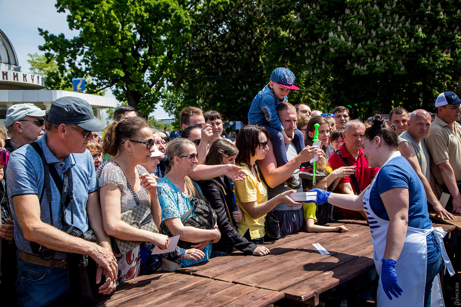 Сегодня день Европы был посвящен 100-летию Одесской киностудии. Поэтому и торт был изготовлен в виде кинопленки, и куски торта, которые раздавали зевакам, были в виде кадров из фильмов.