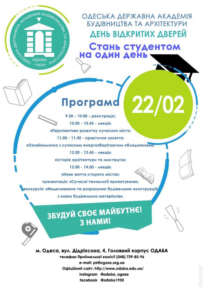 Почувствуй себя студентом: академия строительства и архитектуры зовет на день открытых дверей (общество)Почувствовать себя на один день студентом предлагает всем желающим Одесская академия строительства и архитектуры. День открытых дверей в ОГАСА пройдет 22 февраля. Гостей академии ждут лекции о перспективах развития современных городов, по истории архитектуры и искусства, знакомство с самым современным энергосберегающим оборудованием и строительными материалами. Предварительная регистрация обязательна. Зарегистрироваться можно по ссылке. СМЕРТЬ РОСІЙСЬКИМ ОКУПАНТАМ! Помітили помилку? Виділяйте слова з помилкою та натискайте control-enter Новини по цій темі: 28 вересня 2024: Відновлення пошкоджених будівель і дефіцит кадрів: науковці обговорили перспективи розвитку будівельного комплексу Одеси (фото) 25 вересня 2024: З покет-парком і графіті-стіною: студенти будівельної академії відновлять найсуворіший баскетбольний майданчик Одеси 8 серпня 2024: Напередодні Дня будівельника в Одесі вшановували найкращих співробітників галузі (фото) 28 червня 2024: Український Polygon у Фінляндії: одеські студенти-архітектори представили проєкт перетворення кампусу Гельсінського університету (фото, відео) 15 листопада 2023: У центрі Одеси відкриють музей геноцидів "Територія пам`яті": концепт розробляють студенти та викладачі будівельної академії (фото) |