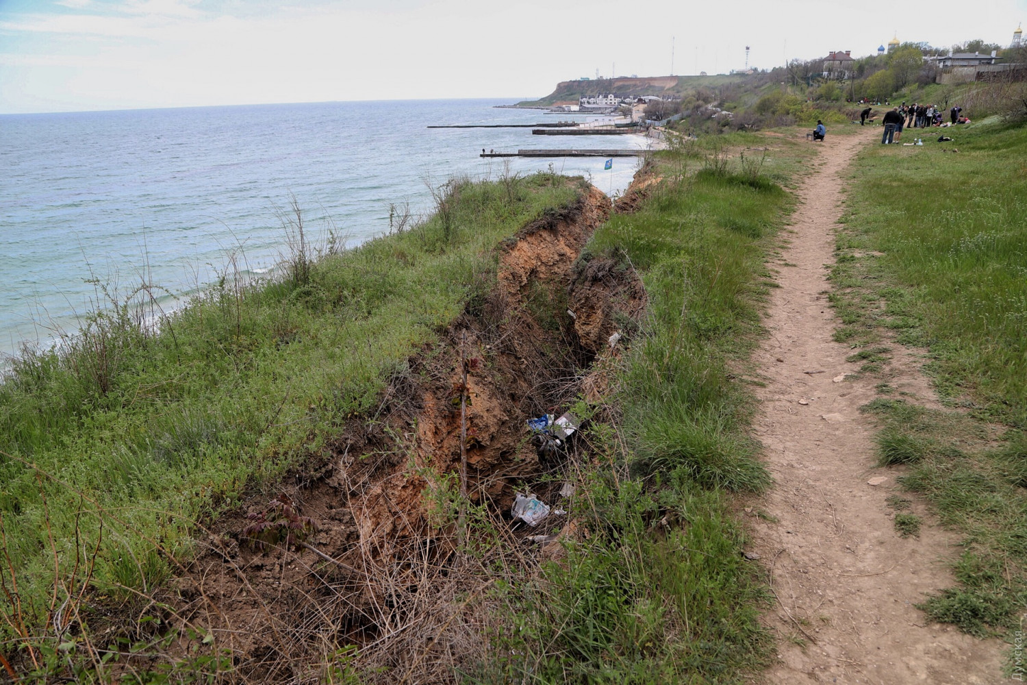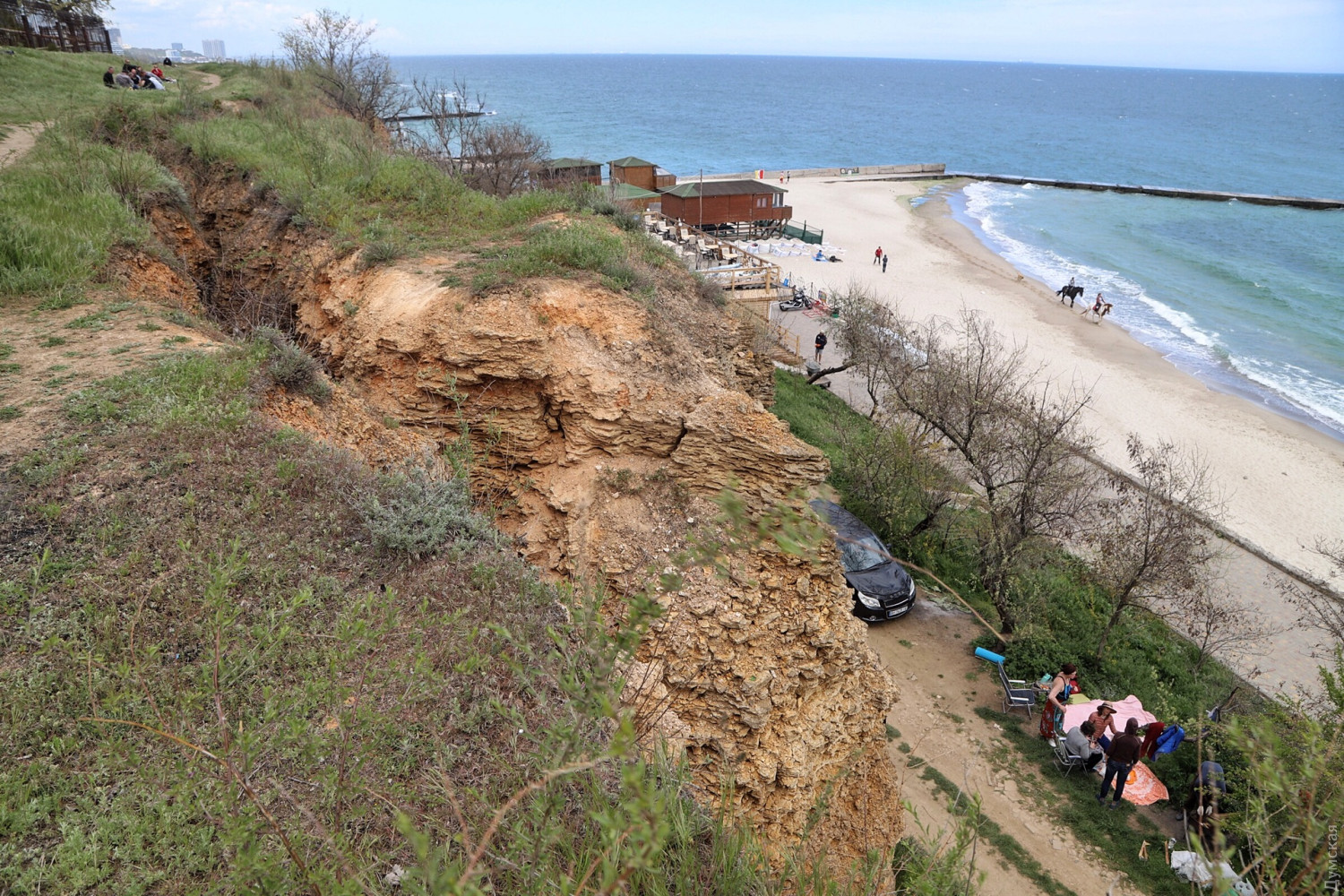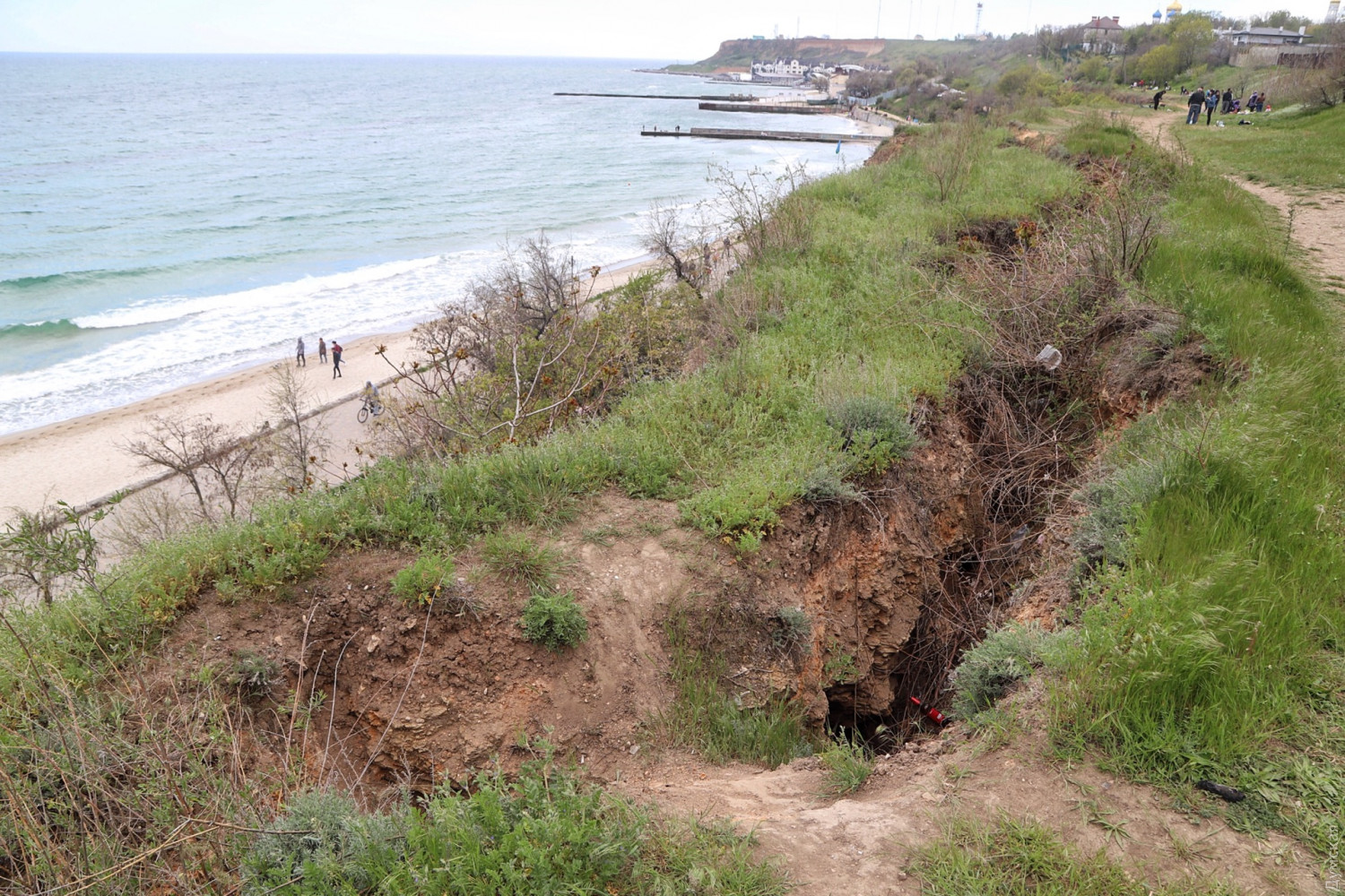 Оползень под санаторием ГСЧС продолжает расти. Но многотонный кусок склона, нависший над дорогой, которая ведет от Маячного переулка к Золотому Берегу, похоже, совсем не пугает одесситов. Некоторые жарят шашлыки как под ним, так и на верхней части террасы. От существующей трещины шириной в метр уже тянется новая — отсекающая от «материка» еще больший кусок породы.