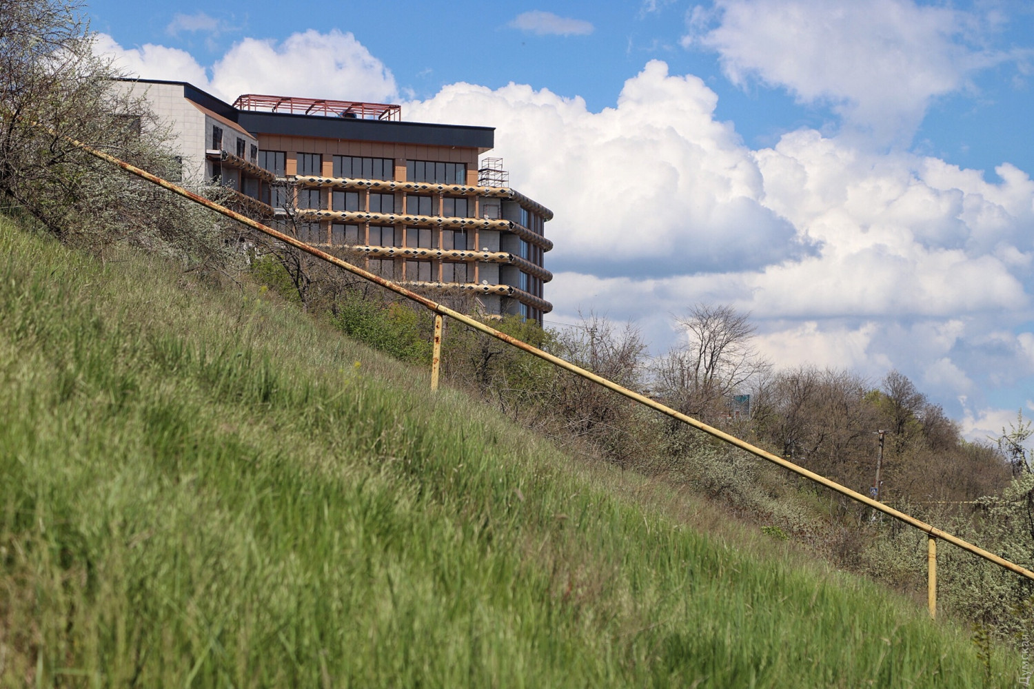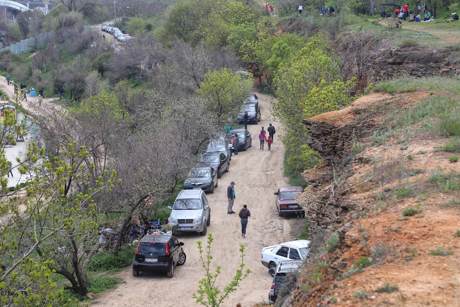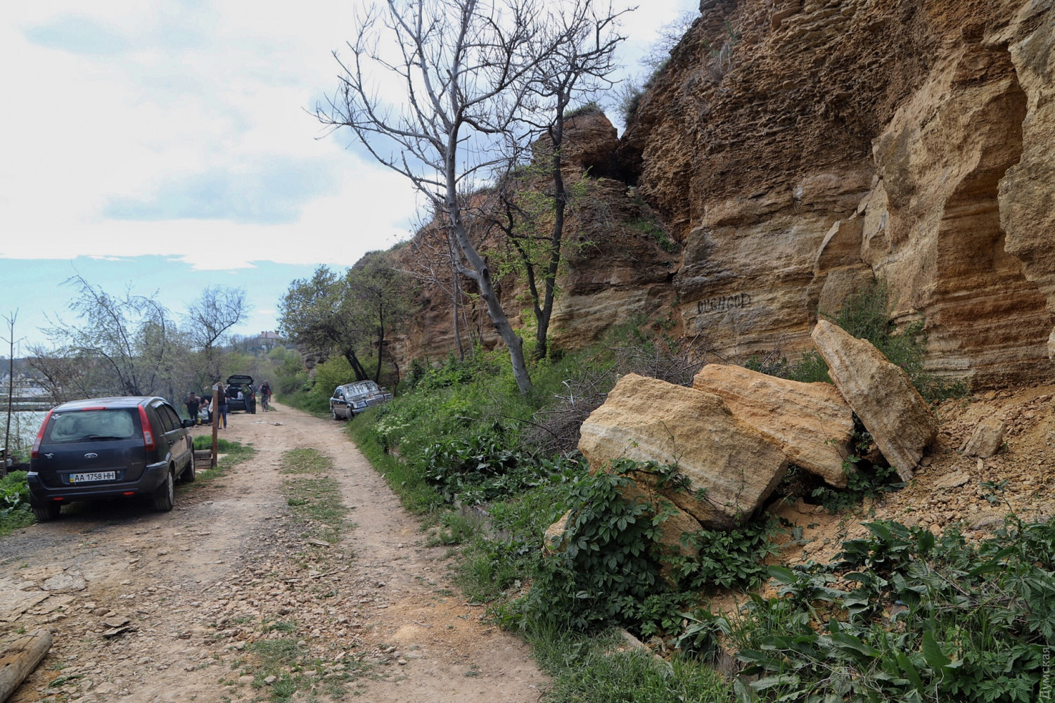 Оползень под санаторием ГСЧС продолжает расти. Но многотонный кусок склона, нависший над дорогой, которая ведет от Маячного переулка к Золотому Берегу, похоже, совсем не пугает одесситов. Некоторые жарят шашлыки как под ним, так и на верхней части террасы. От существующей трещины шириной в метр уже тянется новая — отсекающая от «материка» еще больший кусок породы.
