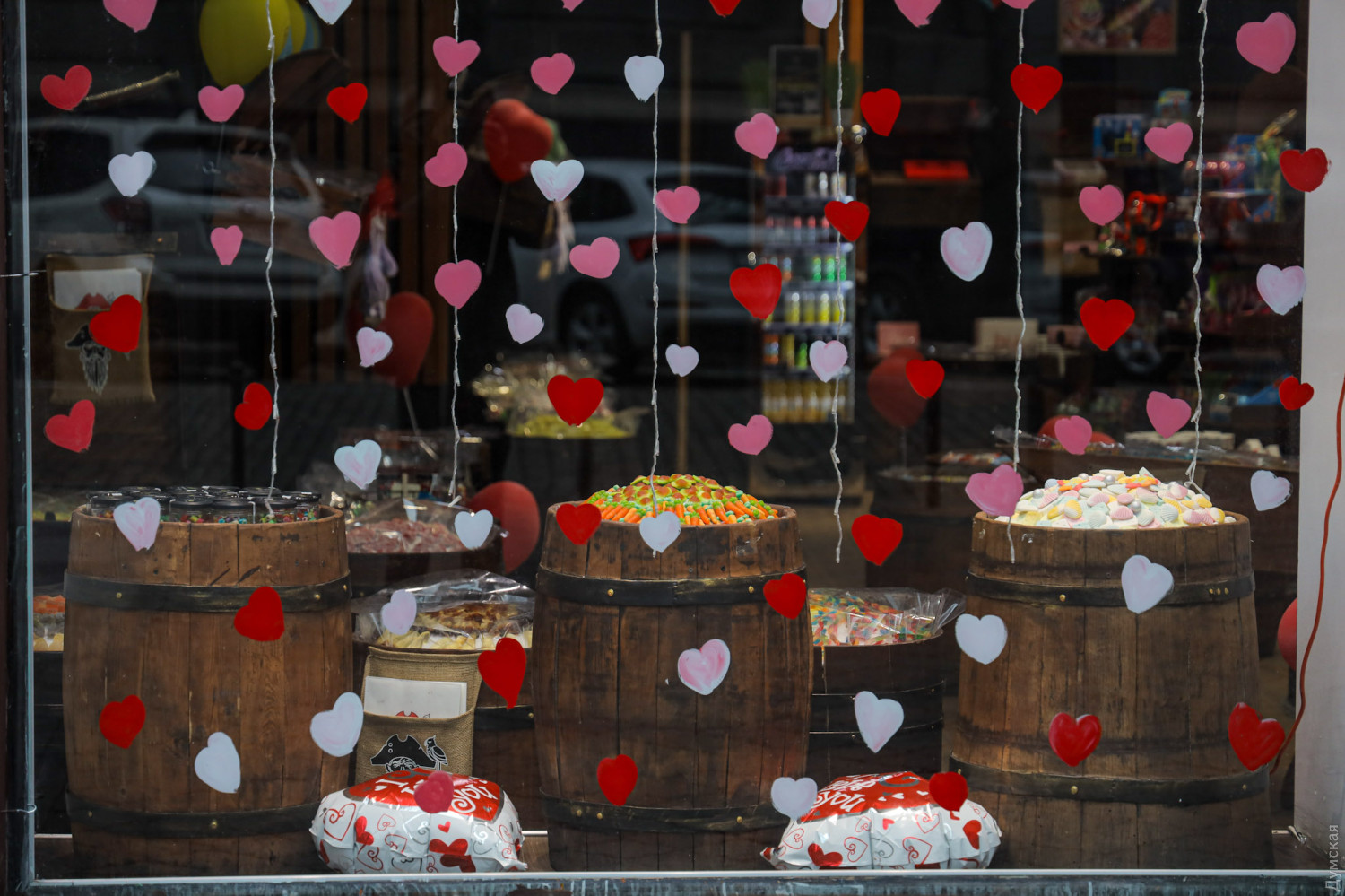 Як повідомляє кореспондент «Думської», вітрини магазинів прикрашені всілякими серцями, ведмедями та іншими романтичними символами. Не відстають у декоруванні кафе та ресторани.