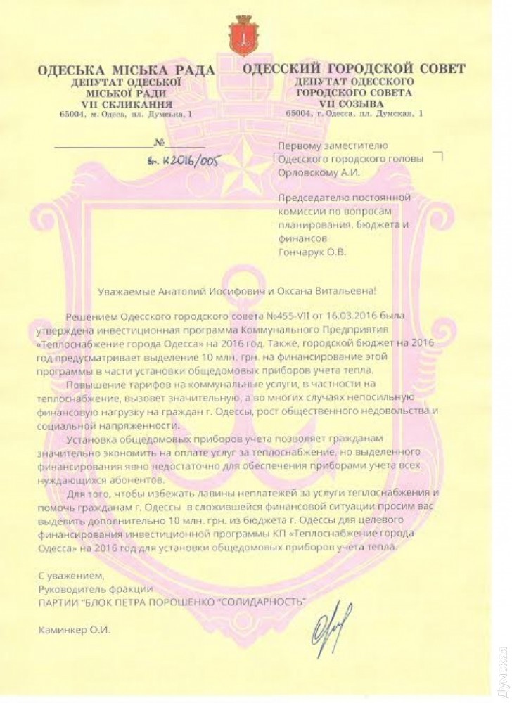 С соответствующим обращением к первому заместителю председателя Одесского городского совета Анатолию Орловскому и председателю постоянной комиссии по вопросам планирования, бюджета и финансов Одесского городского совета Оксане Гончарук обратился руководитель фракции партии «Солидарность» — БПП» в Одесском городском совете Олег Каминкер.
