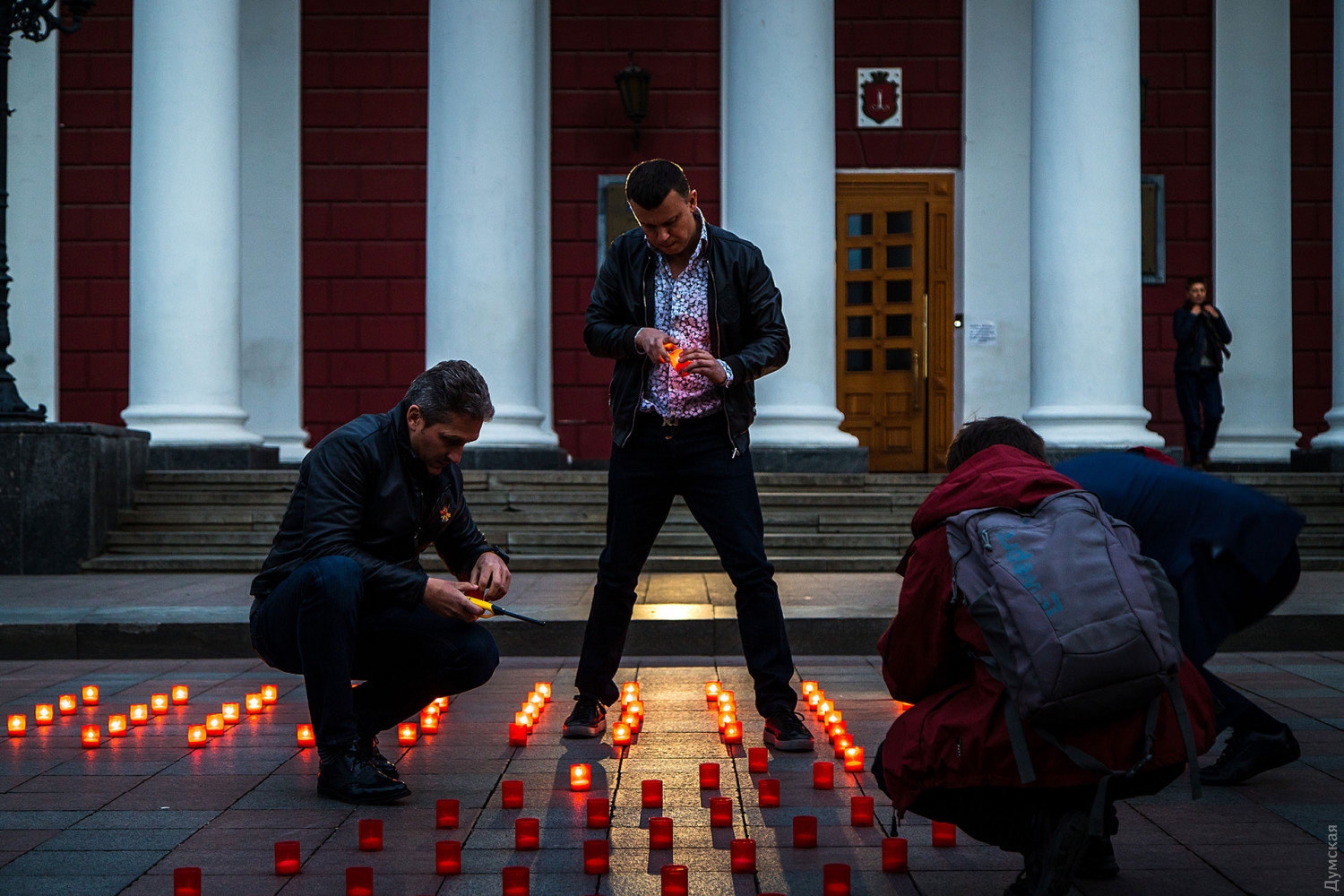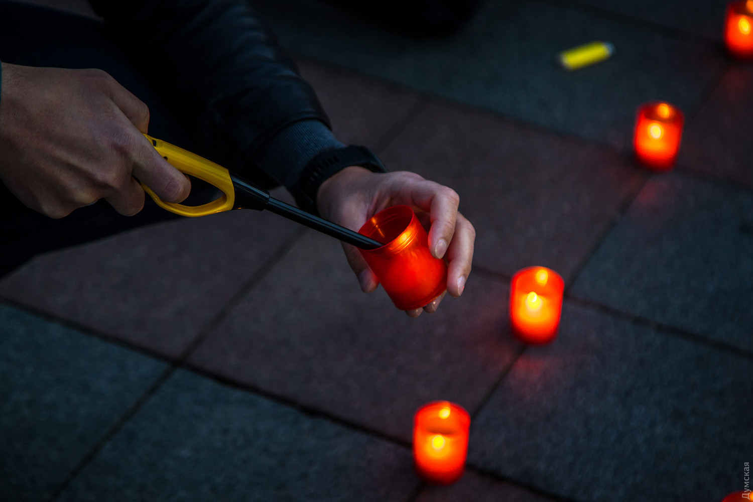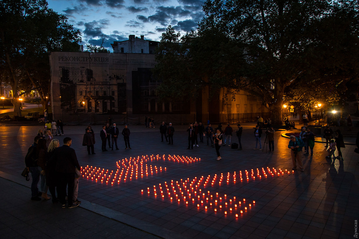 Акция в честь Дня памяти и примирения и годовщины победы над нацизмом во Второй мировой войне прошла сегодня вечером под стенами мэрии на Думской площади. Участники акции — горожане и депутаты горсовета — выложили из лампадок пятиметровые цифры «75».