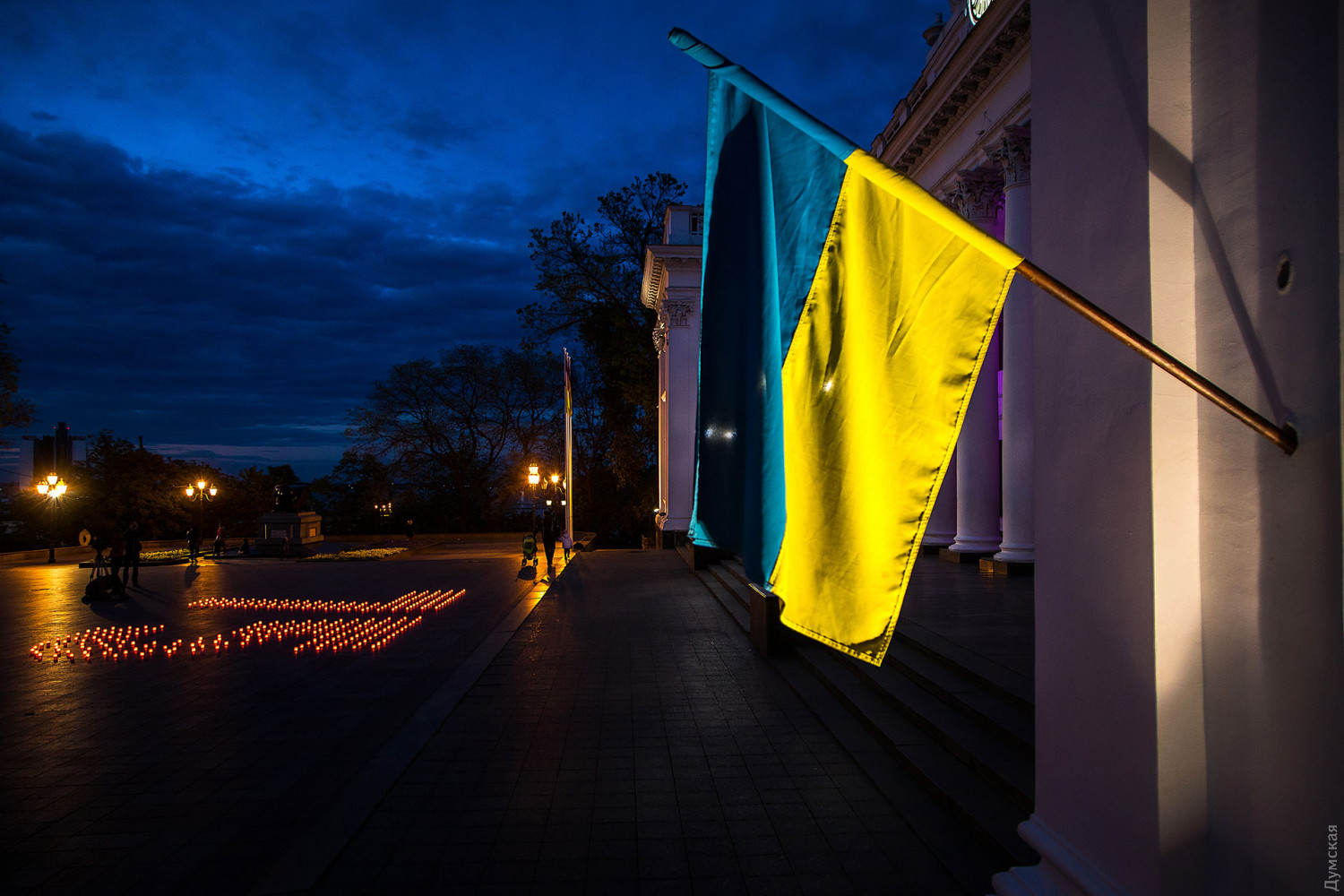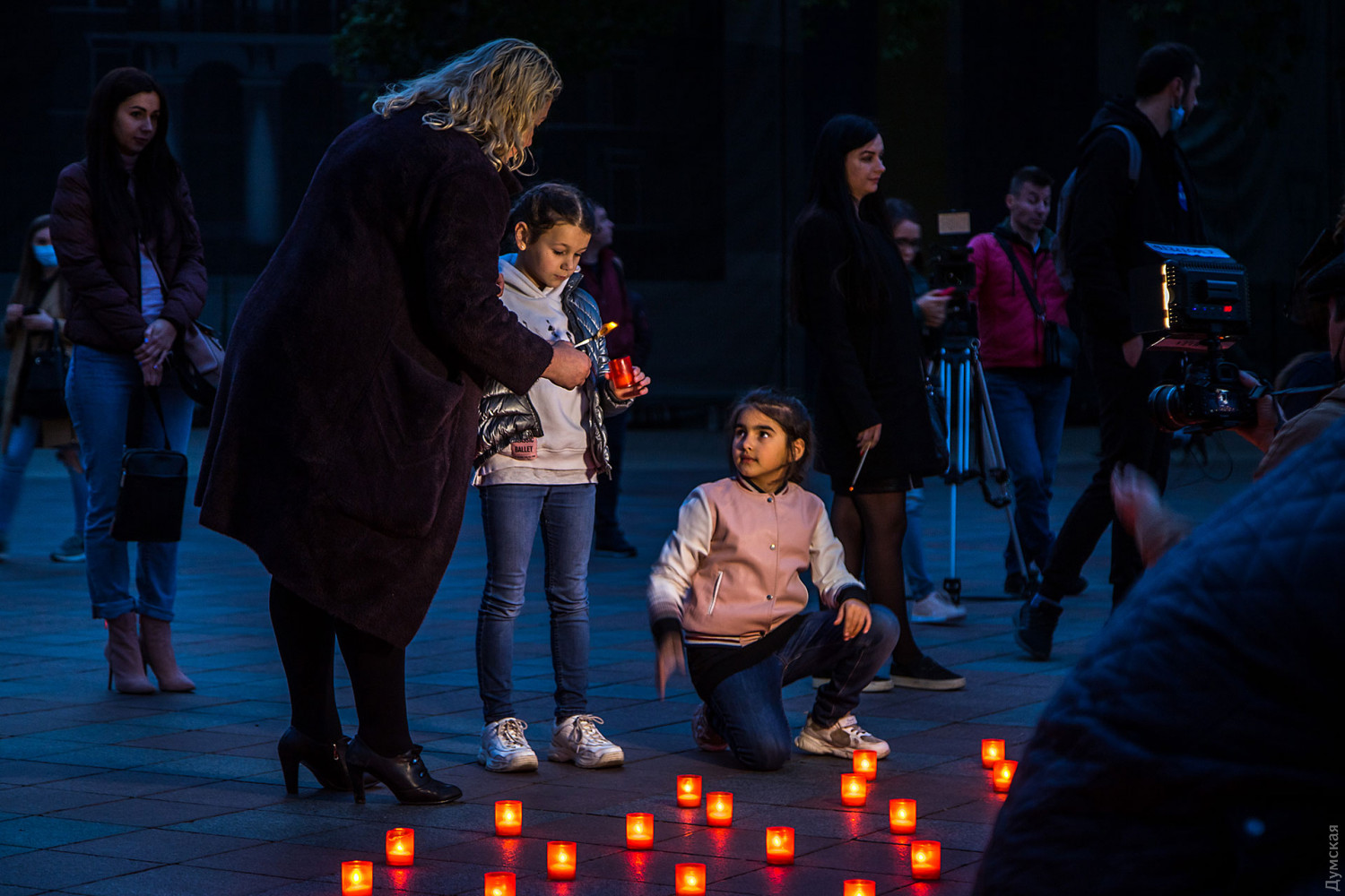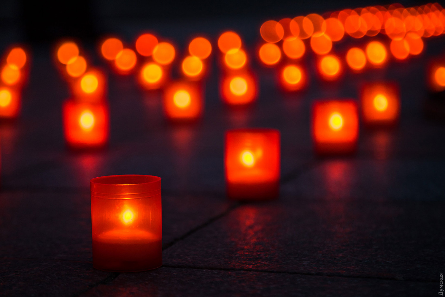 Акция в честь Дня памяти и примирения и годовщины победы над нацизмом во Второй мировой войне прошла сегодня вечером под стенами мэрии на Думской площади. Участники акции — горожане и депутаты горсовета — выложили из лампадок пятиметровые цифры «75».