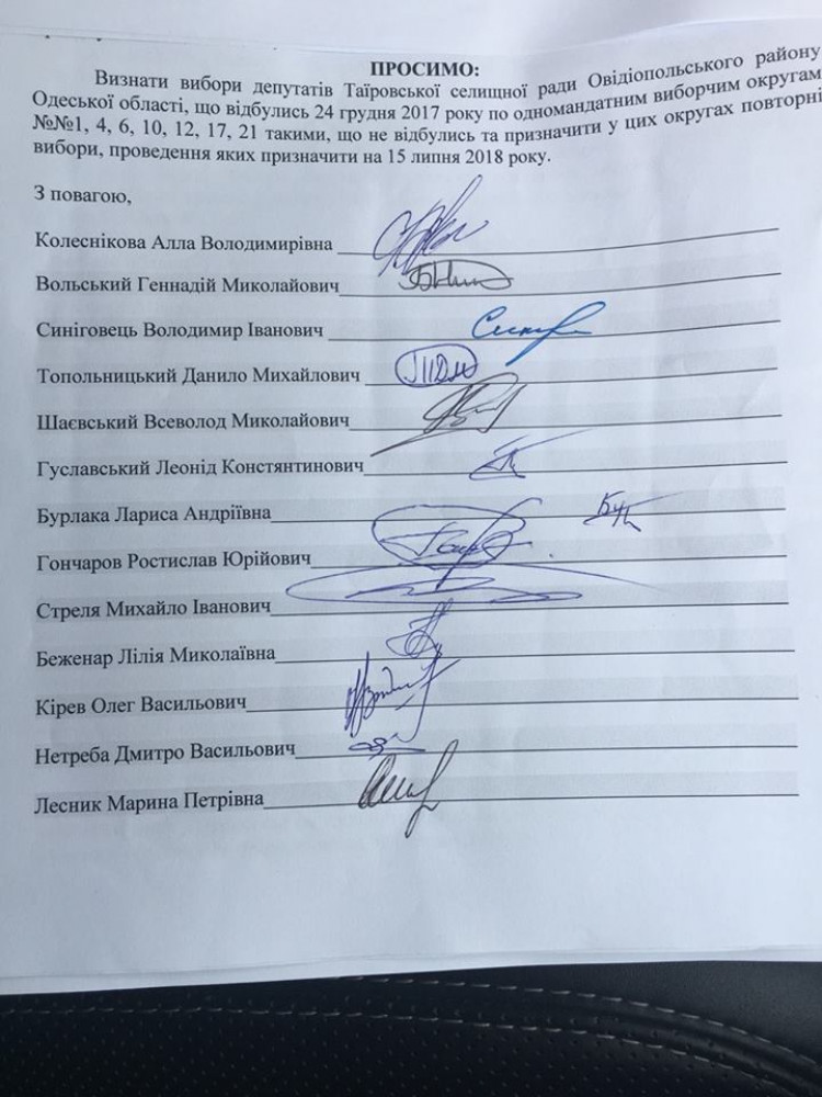 Депутаты Таировской ОТГ просят ЦИК провести перевыборы, чтобы избавиться от прогульщиковНовоизбранные депутаты Таировской объединенной территориальной громады обратились в Центральную избирательную комиссию с просьбой назначить повторные выборы депутатов в семи округах. Обращение опубликовал один из подписавшихся — Даниил Топольницкий на своей странице в Facebook. Ранее, во время третей попытки созвать первую сессию совета громады, депутаты обратились с аналогичной просьбой к Территориальной избирательной комиссии. По мнению депутатов, перевыборы должны быть назначены для избрания членов совета громады вместо тех, которые уже третий раз не являются на первую сессию. Из-за их неявки заседание не может состояться — нет кворума. Глава ТИК Олег Буравлев сообщил, что комиссия уже обратилась в суд, полицию и прокуратуру с заявлениями в отношении восьми прогульщиков. Напомним, 10 мая поселковая избирательная комиссия назначила повторные выборы председателя Таировской объединенной громады. СМЕРТЬ РОСІЙСЬКИМ ОКУПАНТАМ! Помітили помилку? Виділяйте слова з помилкою та натискайте control-enter |