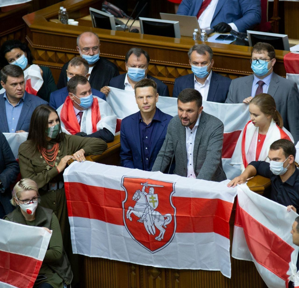 На сегодняшнем заседании Верховной Рады группа нардепов из разных фракций выступила в поддержку участников акций протеста в Беларуси.