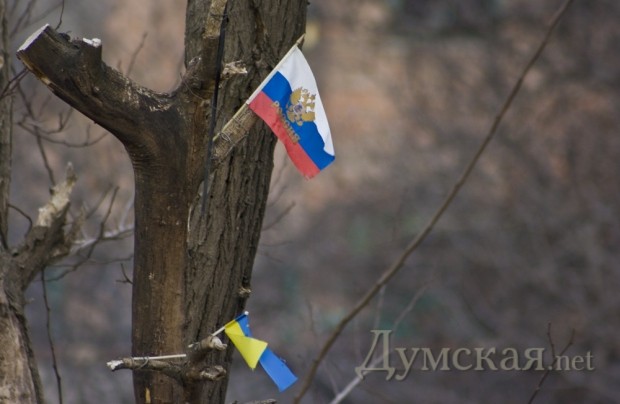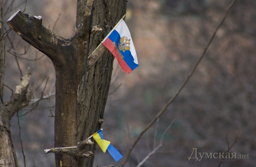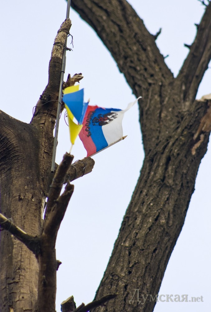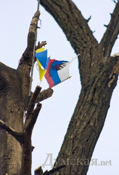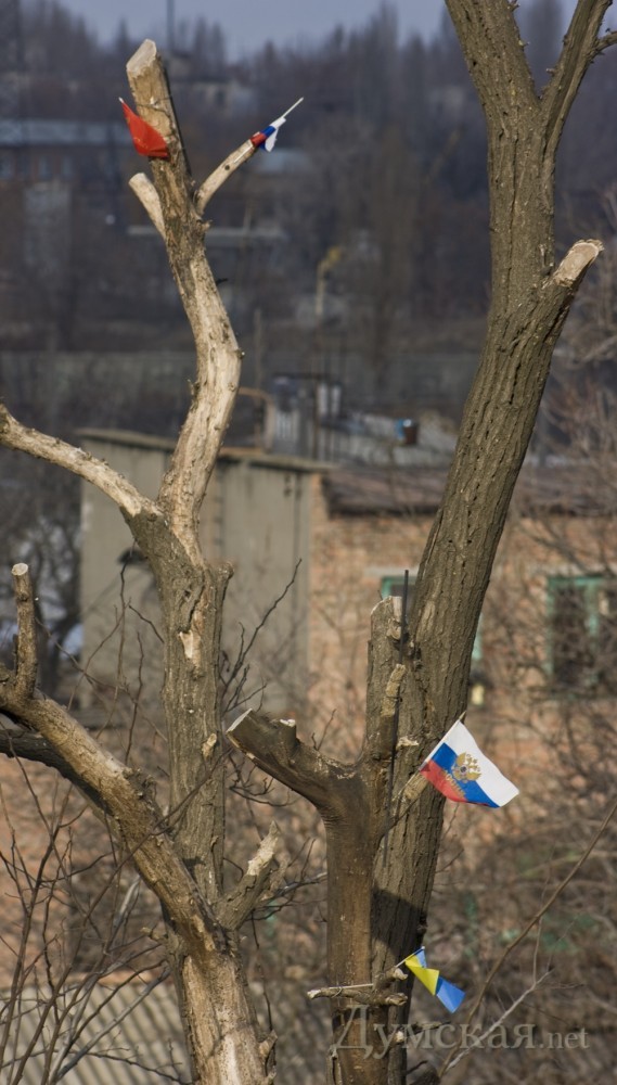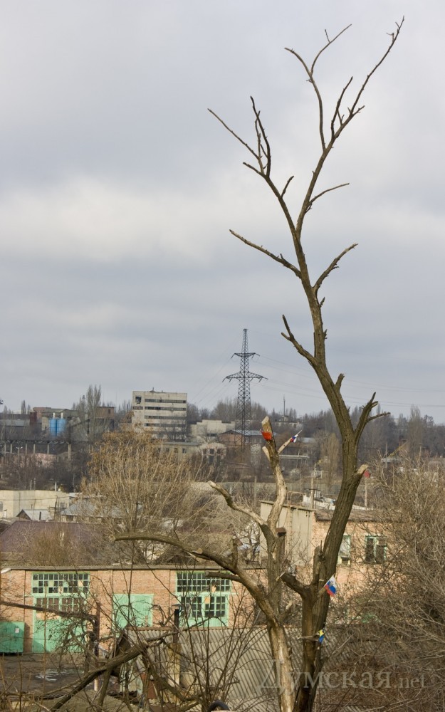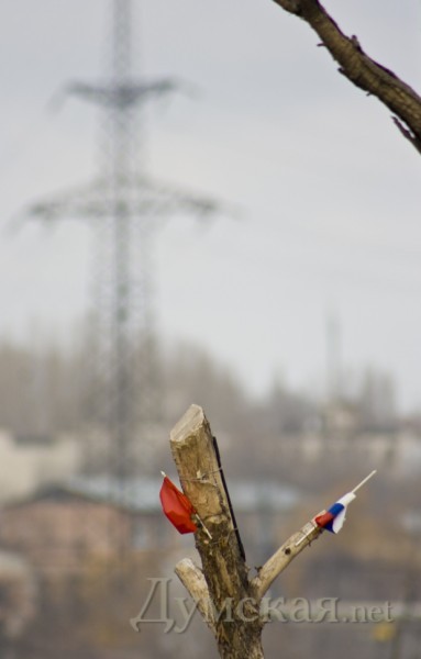 Под Ивановским мостом дерево стало флагштогом для мини-флагов. Красные флажки, а так же символику Украины и России фотокорреспондент «Думской» заметил на верхушке подрезанного дерева.
