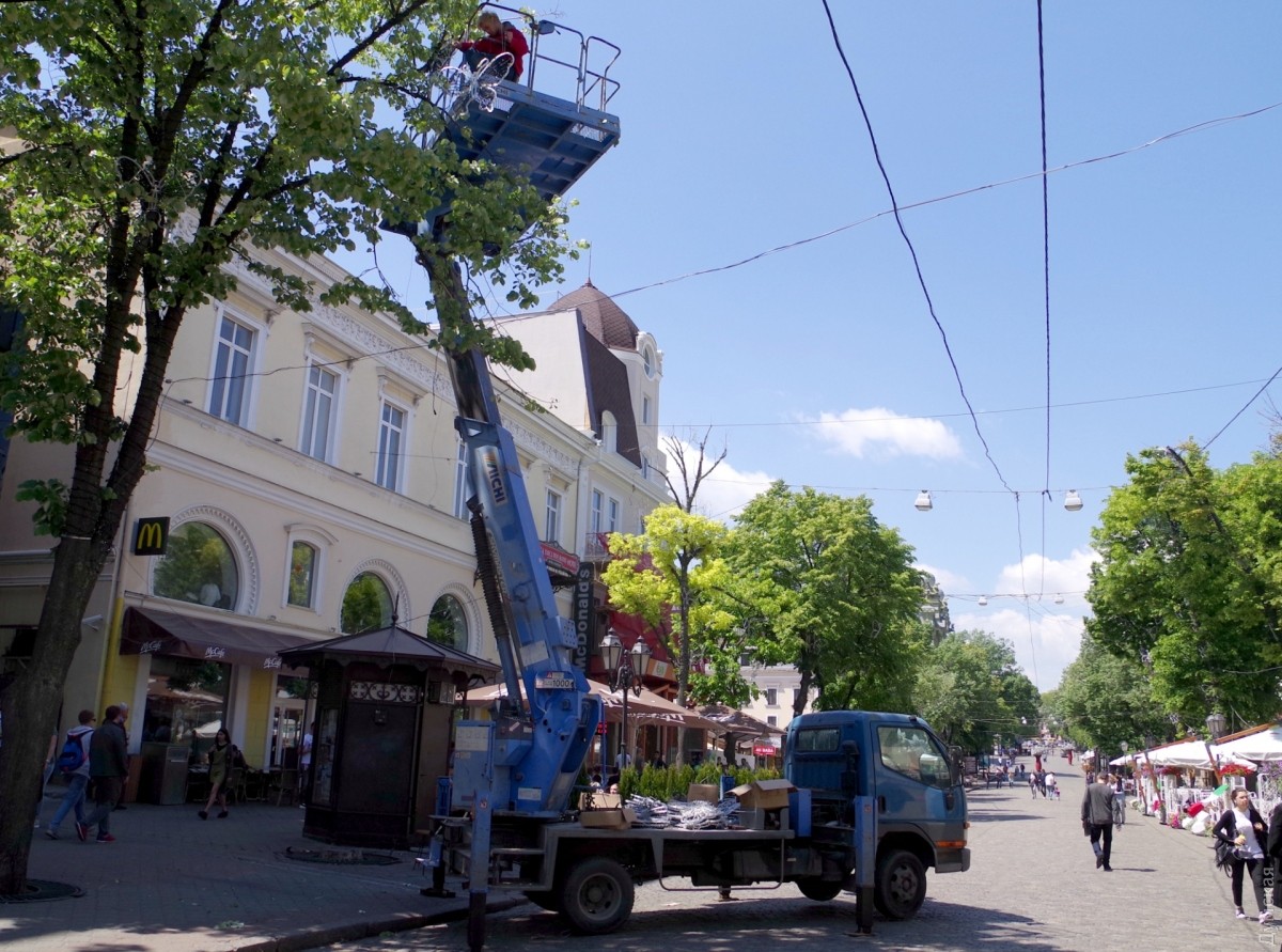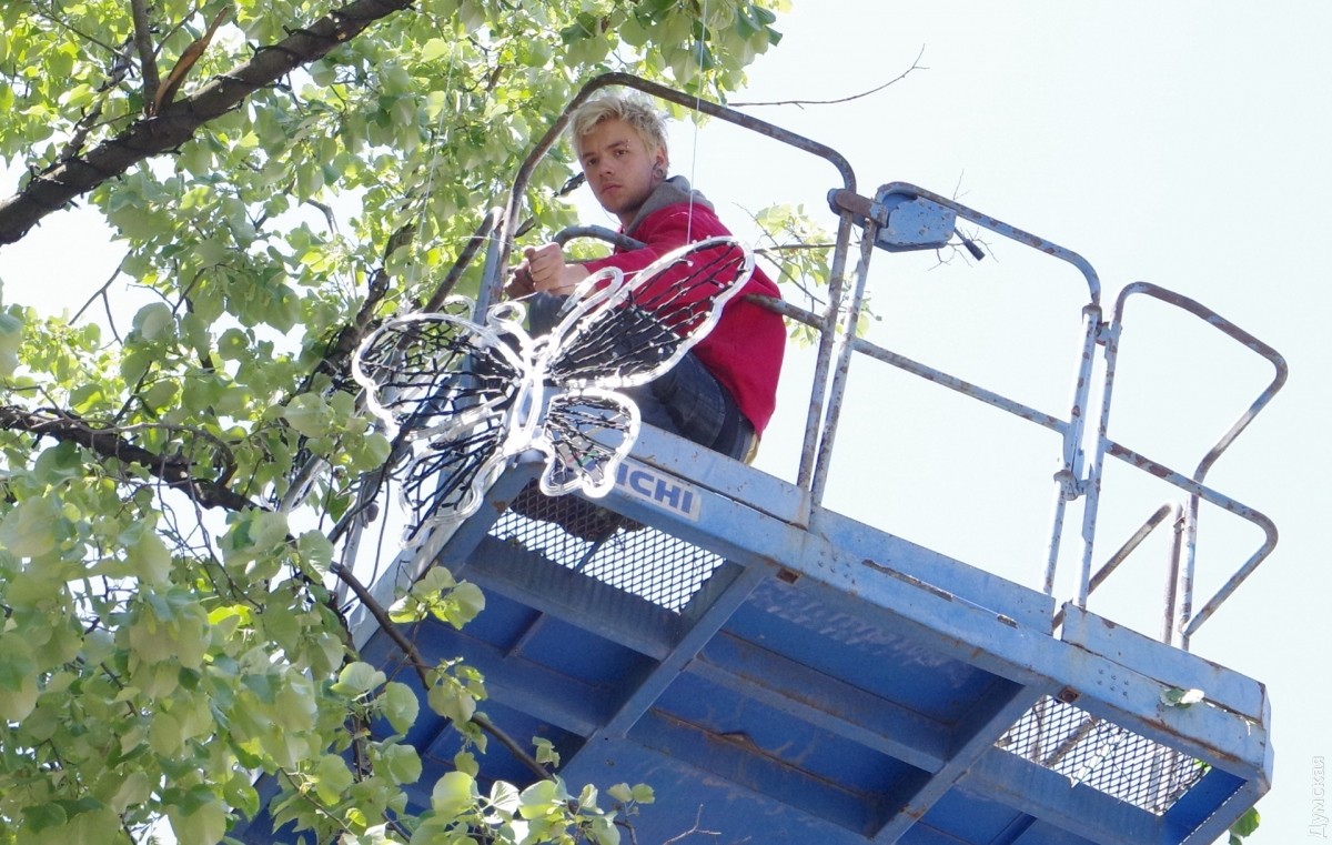Как передает корреспондент «Думской», сейчас на Дерибасовской, под кронами деревьев, монтируют иллюминацию в виде больших бабочек.