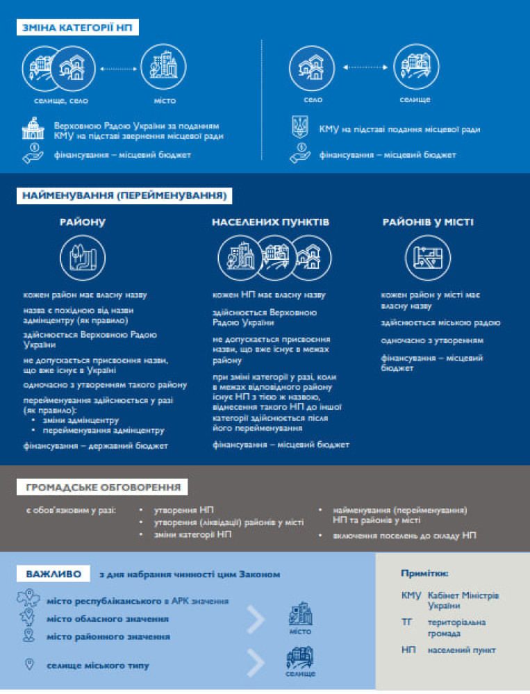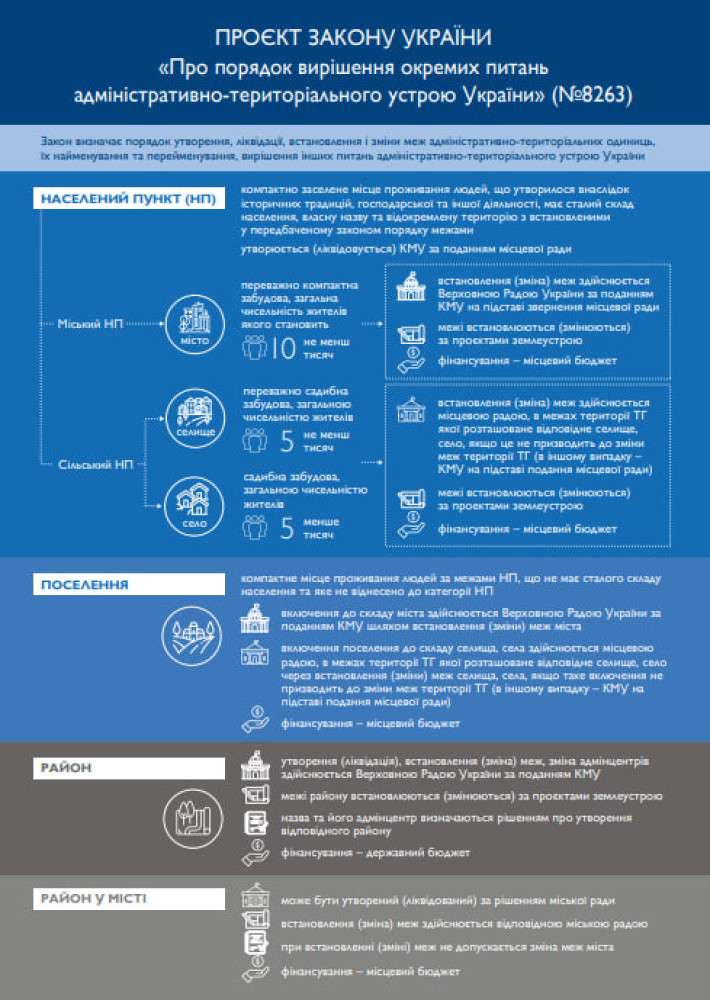 Закон «Про дерадянізацію порядку вирішення окремих питань адміністративно-територіального устрою України» ухвалила в другому читанні та в цілому Верховна Рада. Його підтримали 262 нардепи, 22 утрималися, 50 не голосували, передає кореспондент «Думської». Тепер закон має підписати президент. Чинності він набуде через три місяці після дня публікації. Головне нововведення, яке запроваджується нормативно-правовим актом — ліквідація статусу «селище міського типу». Тепер в Україні будуть тільки міста (понад 10 тисяч осіб), селища (переважно садибна забудова й населення понад 5 тисяч осіб) та села. З'явилося нове поняття — «поселення». Так називатимуть компактні місця проживання людей за межами населених пунктів, без постійного складу населення. Це можуть бути як дачні та садові кооперативи, так і мобільні містечка для, скажімо, вимушених переселенців. До початку повномасштабного вторгнення нацистської росії в Україні налічувалося 885 селищ міського типу. СМЕРТЬ РОСІЙСЬКИМ ОКУПАНТАМ! Помітили помилку? Виділяйте слова з помилкою та натискайте control-enter |