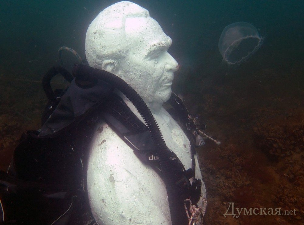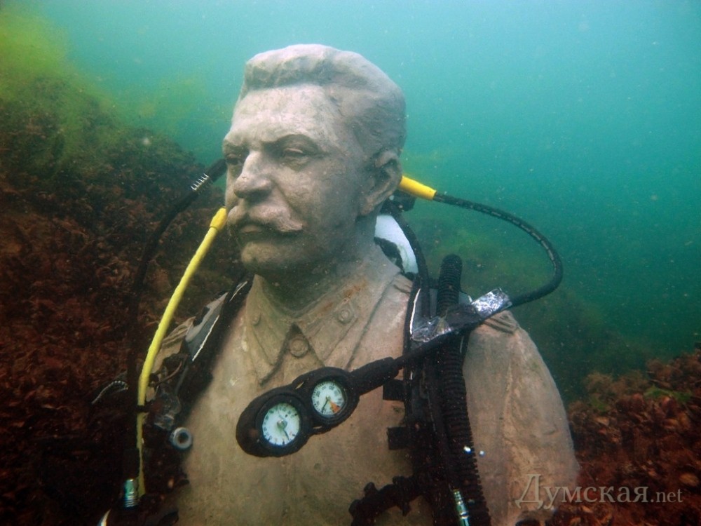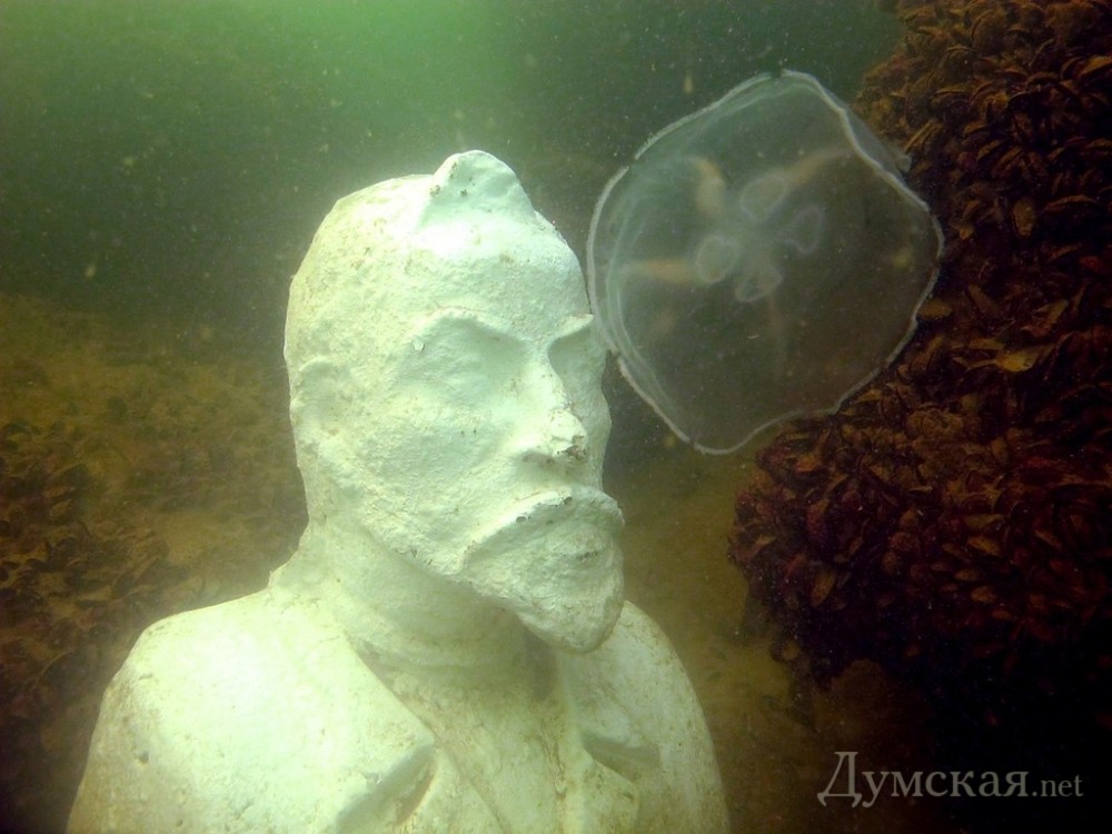 Десять метров под водой: одесские водолазы открыли необычную экспозицию прямо в море«Думская» продолжает постоянный цикл материалов о малоизвестных музеях Одессы. На сей раз мы расскажем о самом необычном собрании — подводном. Музей этот находится посреди Одесского залива, между Ланжероном и портом. Со стихией боролась наш постоянный автор Юлия Сущенко. Странные ощущения охватывают, когда подходишь к этому месту. С одной стороны бывший судоремонтный завод, с другой – бывшая водолазная станция. Под водой – бывшие руководители бывшей страны. За железной дверью – сохнущие на веревке гидрокостюмы, якоря. На столе стоит бюст советского военачальника. На полу резвится целый выводок разномастных котов. Вы – в «запасниках» подводного музея. Вечно живой Ленин, друг всех народов товарищ Сталин, железный Феликс и другие известные фигуры советской истории стали экспонатами и находятся под толщей воды. Посмотреть на подводные экспонаты можно не только днем, но и ночью. Говорят, при свете фонаря на десятиметровой глубине ощущения почти как в космосе. Основатель необычного музея — водолаз МЧС с 26-летним стажем Сергей Зятиков. Идею он вынашивал давно: «Я много смотрел видео в интернете о таких музеях, особенно мне понравился подводный музей в Мексике. Подумал, почему бы в Одессе не организовать подобный? — говорит он. - Я очень люблю Одессу и хочу, чтобы гости города увидели, кроме красивой архитектуры, наше главное богатство – море». В Украине подобные экспозиции есть только в Крыму, на Тарханкуте, и в Днепропетровске. А теперь и в Одессе. В прошлом году Сергей собрал команду из пяти профессиональных водолазов, и дело пошло. Сейчас в экспозиции восемь бюстов, якоря, собранные со всей акватории, противодесантные ежи, старинные ядра и более современные гильзы орудий времен Великой Отечественной войны. В августе смотрители музея торжественно погрузили на дно еще один экспонат – стол с компьютером. «Осталось только провести Интернет», — шутят дайверы. Охраняет все это большой белый пес. В следующем году экспонатов станет больше. В музей планируют притащить старый баркас и установить специальный тренажер для дайверов. Скульптуры и бюсты для экспозиции делают из специального бетона – обычный гипс быстро разрушится в морской воде. Для того, чтобы они сохраняли белый цвет, каждые два месяца им по очереди устраивают «санитарные дни» — вытаскивают наружу и очищают от мидий, песка и водорослей. Кроме, собственно, экспонатов, вокруг много представителей морской фауны, за которыми также занятно наблюдать во время погружения. Где-то пробежит краб, проплывет рыба-игла. Бычки и стайки ферины постоянно снуют рядом. Немного глубже – целые поля мидий. Правда, попадается очень много пустых – это дело рук морского хищника рапаны. Дайверы говорят, что эти моллюски очень вредят нашей акватории. «К сожалению, нам не разрешают их вылавливать в большом количестве. Как только выходим в море, тут же подплывают пограничники и говорят, что мы не имеем прав на вылов рапаны – действует какой-то закон, по которому можно набирать не более пятнадцати штук в одни руки, — говорит Сергей Зятиков. — Я не нашел в интернете такого закона и вообще не понимаю, почему пограничники занимаются рапаной. У нас все как-то не так. В США, например, за них государство еще и доплачивае