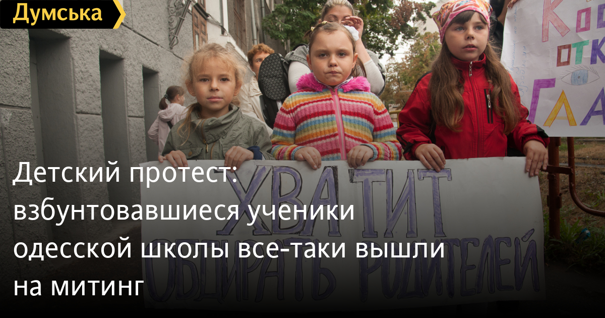 Детский протест: взбунтовавшиеся ученики одесской школы все-таки вышли на митингУченики провели акцию протеста у здания 59-ой школы олимпийского резерва, что на Канатной улице. Как передает корреспондент «Думской», у входа в учреждение собралось около полусотни школьников, их родителей и выпускников. Они требовали вернуть на должность директора школы Раису Олийнык, проработавшую здесь 30 лет, а также призывали власти обратить внимание на действия нового руководителя Анны Чернухиной, которая «не умеет работать с детьми и первым делом начала вымогать деньги у родителей». При этом пропускной режим в школе во время митинга был ограничен – некоторые ученики, которым не удалось выйти на улицу, показывали плакаты через окна.