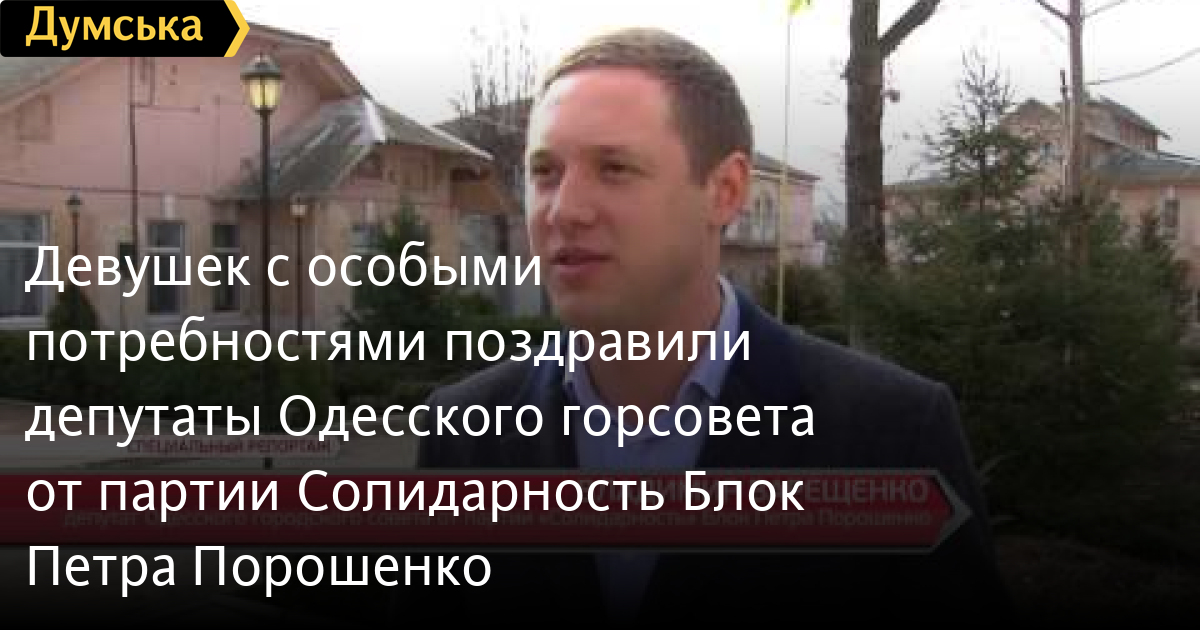 Девушек с особыми потребностями поздравили депутаты Одесского горсовета от партии «Солидарность» Блок Петра ПорошенкоСМЕРТЬ РОССИЙСКИМ ОККУПАНТАМ! Заметили ошибку? Выделяйте слова с ошибкой и нажимайте control-enter Думская ТВ. Сюжеты: