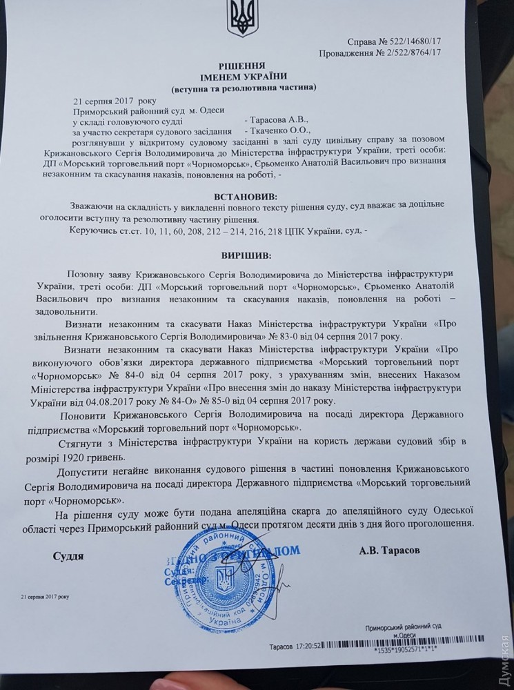 «Допустить немедленное исполнение судебного решения в части восстановления Крыжановского Сергея Владимировича на должности директора Государственного предприятия «Морской торговый порт «Черноморск»,- говорится в решении Приморского суда.