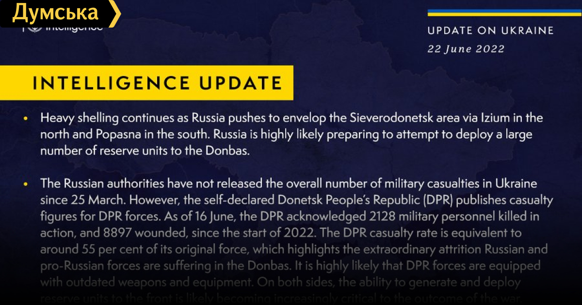 «ДНР» потеряла больше половины своих боевиков, рф готовится перекинуть на Донбасс значительные резервы, — британская разведкарф планирует перебросить на Донбасс большое количество резервных подразделений, а террористическая ДНР с начала года потеряла половину личного состава. Об этом сообщает минобороны Британии в свежем разведывательном обзоре. Россия стремится окружить Северодонецк через Изюм на севере и Попасную на юге, говорится в сообщении. Враг, очень вероятно, перебросит на Донбасс значительны резервы. рф не давала официальных данных о потерях с 25 марта. В то же время террористическая ДНР 16 июня признала 2128 военнослужащих погибшими и 8897 ранеными с начала 2022 года. «Уровень потерь «ДНР» эквивалентен примерно 55% их начальной численности, что подчеркивает чрезвычайное истощение российских и пророссийских сил на Донбассе. Высокая вероятность того, что силы «ДНР» оснащены устаревшим вооружением и техникой», — говорится в сообщении британской разведки. Способность сторон сформировать и развернуть резервные подразделения становится, судя по всему, все более важной для результата войны, резюмируют в ведомстве. СМЕРТЬ РОСІЙСЬКИМ ОКУПАНТАМ! Помітили помилку? Виділяйте слова з помилкою та натискайте control-enter |