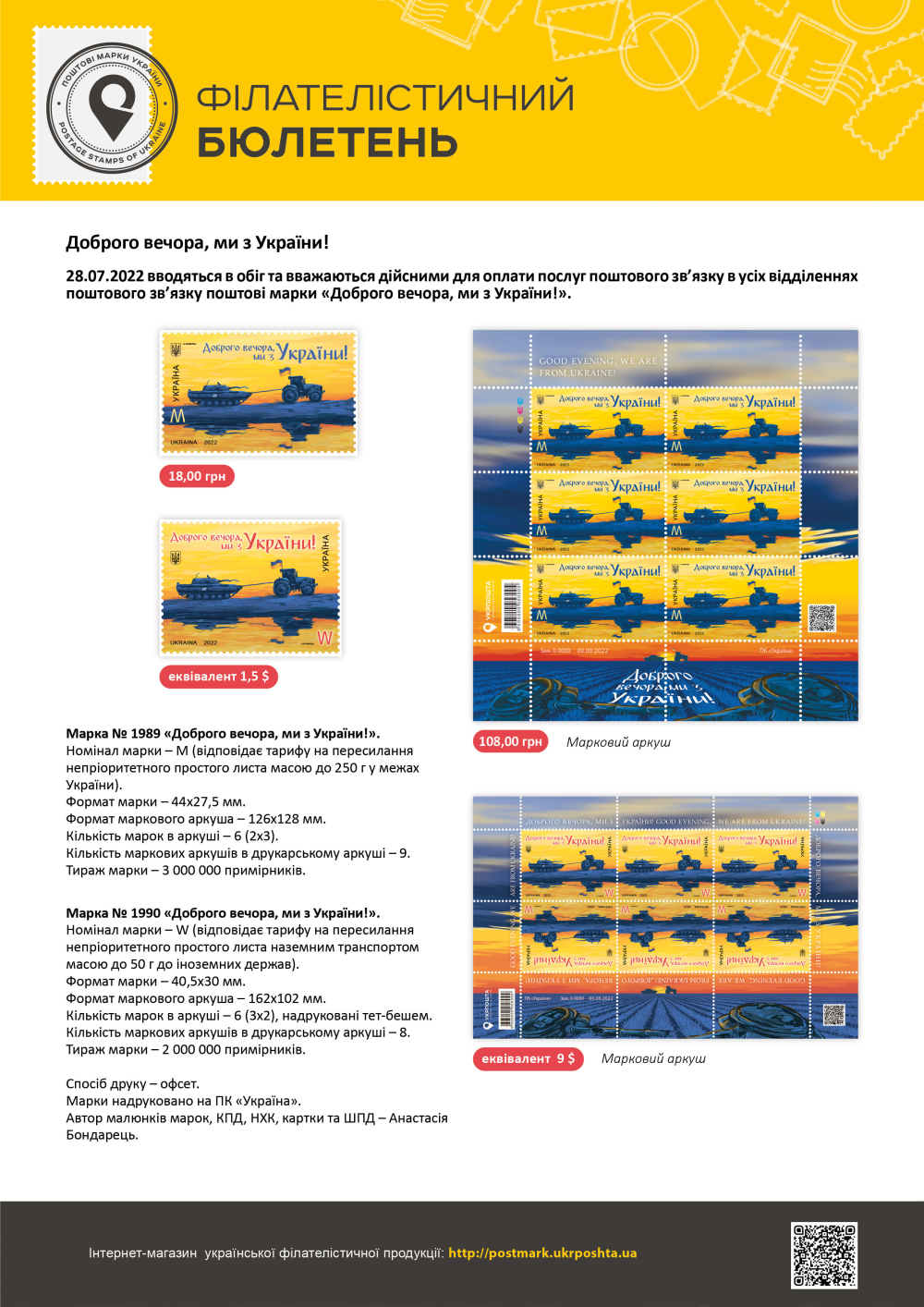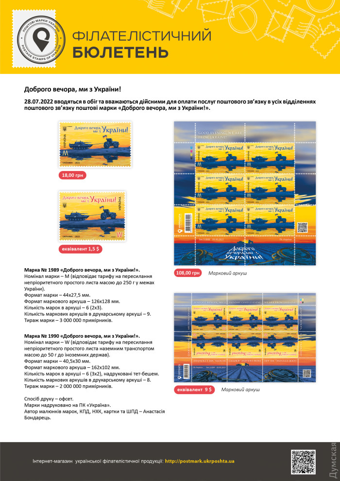 «Доброго вечора, ми з України»: на одеському головпоштамті почнуть продаж нової марки та відкриють фотовиставку «Неочевидна війна»Поштову марку «Доброго вечора, ми з України!», третю в серії присвяченій російсько-українській війні, почнуть продавати вже в цей четвер, 28 липня. Урочисте спеціальне погашення традиційно відбудеться в головному залі одеського головпоштамту об 11:00. На марці, виданій тиражом п'ять мільйонів екземплярів, зображено український трактор, який тягне розтрощений російський БМП. Авторка малюнку — Анастасія Бондарець. Крім того, цього дня відкриється фотовиставка «Неочевидна війна», авторами якої виступили шість українських фотографів, п’ять із яких одесити, зокрема фотокореспондент нашого віддання. «Війна — це тотальна зміна всього устрою, зв'язків та звичок для всіх і кожного, незалежно від того, як далеко від фронту знаходиться людина. Ця війна торкнулася майже всіх і всього, навіть у повсякденних дрібницях. Під час виставки ви зможете наживо залишити свої відгуки та стати свідками іншого інтерактиву, який для вас підготували митці», — наголошують організатори фотовиставки. Фотографи-автори: Після Одеси «Неочевидну війну» планують показати в країнах Євросоюзу, Азії та Північної Америки. СМЕРТЬ РОСІЙСЬКИМ ОКУПАНТАМ! Помітили помилку? Виділяйте слова з помилкою та натискайте control-enter |