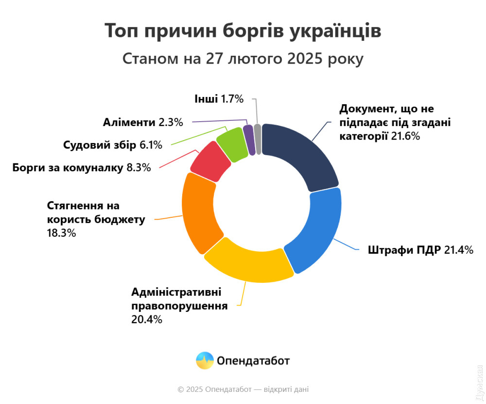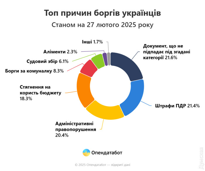 Зазначається, що з грудня 2024 року до березня 2025-го, з моменту останнього оновлення Єдиного реєстру боржників, українці накопичили понад 164 тис нових боргів. Наразі у реєстрі зафіксовано понад 9 млн боргів, що на 1,9% або 164 304 провадження більше, ніж коли реєстр припинив роботу через наймасштабнішу хакерську атаку. Найчастіше українці не сплачують штрафи за порушення ПДР — 1,9 млн. Борги за адміністративні правопорушення складають понад 1,8 млн. Замикають трійку стягнення на користь державного бюджету — 1,6 млн. Майже 75% усіх боргів припадає на чоловіків. Як писала раніше «Думська», Одеська область посідає друге місце в країні за кількістю поданих до суду скарг за несплату комунальних послуг. Крім того, водії Одещини в лідерах за неоплаченими штрафами. Помітили помилку? Виділяйте слова з помилкою та натискайте control-enter |