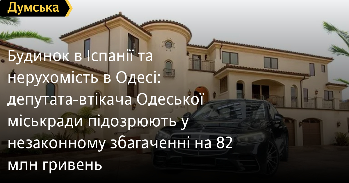 Будинок в Іспанії та нерухомість в Одесі: депутата-втікача Одеської міськради підозрюють у незаконному збагаченні на 82 млн гривеньУ незаконному збагаченні на 81,7 млн грн підозрює Національне агентство з питань запобігання корупції депутата Одеської міської ради та його сім'ю. Як повідомили у пресслужбі НАЗК, під час перевірки способу життя депутата встановили, що у 2021-2024 роках він, його сім'я та пов'язані особи купили активи без підтверджених законних доходів. Йдеться про: - нежитлові приміщення в Одесі вартістю 14,9 млн грн і 1,5 млн грн; - квартири в Одесі на 7,2 млн грн; - 100% статутного капіталу приватного підприємства (майже 12 млн грн); - елітне авто Mercedes-Benz S400 CDI (5,4 млн грн); - будинок і земельну ділянку в Іспанії (40,7 млн грн). У НАЗК вважають, що депутат, який з 2010 року був членом комісії з питань комунальної власності, привласнив нежитлові приміщення в Одесі через громадську організацію, яка нібито займалася захистом людей з інвалідністю. Крім того, його дочка купила дорогу нерухомість, автомобілі та корпоративні права, не маючи офіційних джерел доходу. Нацагентство передало матеріали до Одеської обласної прокуратури. За даними «Думської», йдеться про Олександра Матвєєва. Правоохоронні органи зацікавилися ним у квітні минулого року через схему із заволодіння об'єктами нерухомості в центрі міста. Депутат разом зі знайомим адвокатом і ще двома помічниками орендували нерухомість на ім'я підконтрольних громадських організацій, а потім викуповували їх за заниженою ціною. Надалі приміщення об'єднували з підвалами або горищами і за допомогою підроблених документів оформляли на підставних осіб право власності. Частину привласнених приміщень потім переобладнали у квартири та продали. Таким чином шахраї заволоділи трьома об'єктами в центрі Одеси та земельною ділянкою в Пересипському районі. Громада зазнала збитків на понад 11 млн грн. Вже наприкінці травня стало відомо, що Матвєєв утік із країни, а на початку грудня 2024 року його оголосили в міжнародний розшук. Наразі депутат живе у своєму маєтку в іспанській Марбельї. Помітили помилку? Виділяйте слова з помилкою та натискайте control-enter |