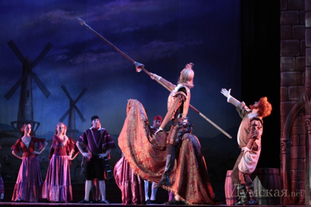 Обратите внимание на задник сцены, где изображены ветряные мельницы — потенциальные «противники» Дона Кихота. Не знаю, где художник мог их видеть. Во-первых, все ветроколеса стоят в одном положении. Во-вторых, неясно, как в них подается пшеница и откуда выйдут мешки с мукой. А в — третьих, если бы хотя бы на одной висел флаг ПР — это была бы и правда, и «бомба». Одесса с этим балетом прогремела бы на всю Украину.