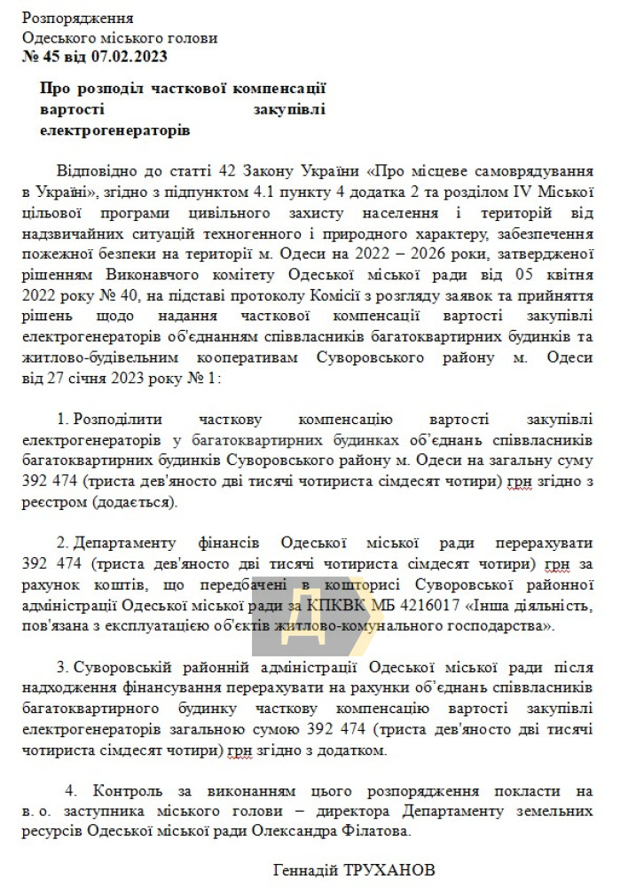 «Довіряй справам», «Руський дім» та «Романівський»: які ОСББ отримають компенсацію за купівлю генератора (документ)Ще шість ОСББ отримають загалом майже 400 тисяч гривень компенсації за купівлю генератора. Про це свідчить розпорядження міського голови Геннадія Труханова №45 від 7 лютого. Від трохи понад 40 тисяч гривень до максимально можливих 100 тисяч отримають ОСББ «Романівський», ОСББ «Марсель-44», ОСББ «Довіряй справам», ОСББ «Одисей 34», ОСББ «Руський Дім» та ОСББ «Гранд Парк 24». Нагадаємо, перші шість об'єднань співвласників багатоквартирних будинків отримали загалом 409 тис. 300 грн компенсації. Нагадаємо, рішення про компенсацію 70% вартості генераторів, що закуповуються об'єднаннями співвласників, ухвалила на сесії 30 листопада Одеська міськрада. Суть програми проста — ОСББ купує генератор, потім звертається до райадміністрації з усіма чеками і документами та отримує компенсацію 70% вартості (але не більше 100 тис. грн на будинок). За такі гроші можна придбати генератор, який живитиме котельню, помпи для води, і, можливо, ліфт. Також його вистачить, щоб мешканці могли зарядити телефони. СМЕРТЬ РОСІЙСЬКИМ ОКУПАНТАМ! Помітили помилку? Виділяйте слова з помилкою та натискайте control-enter |