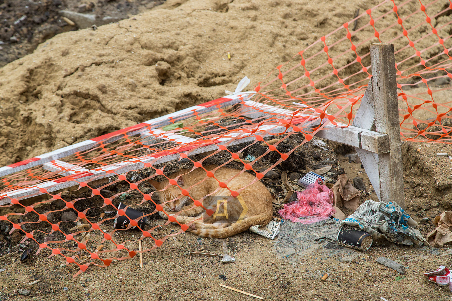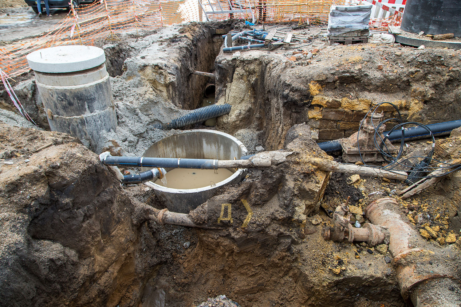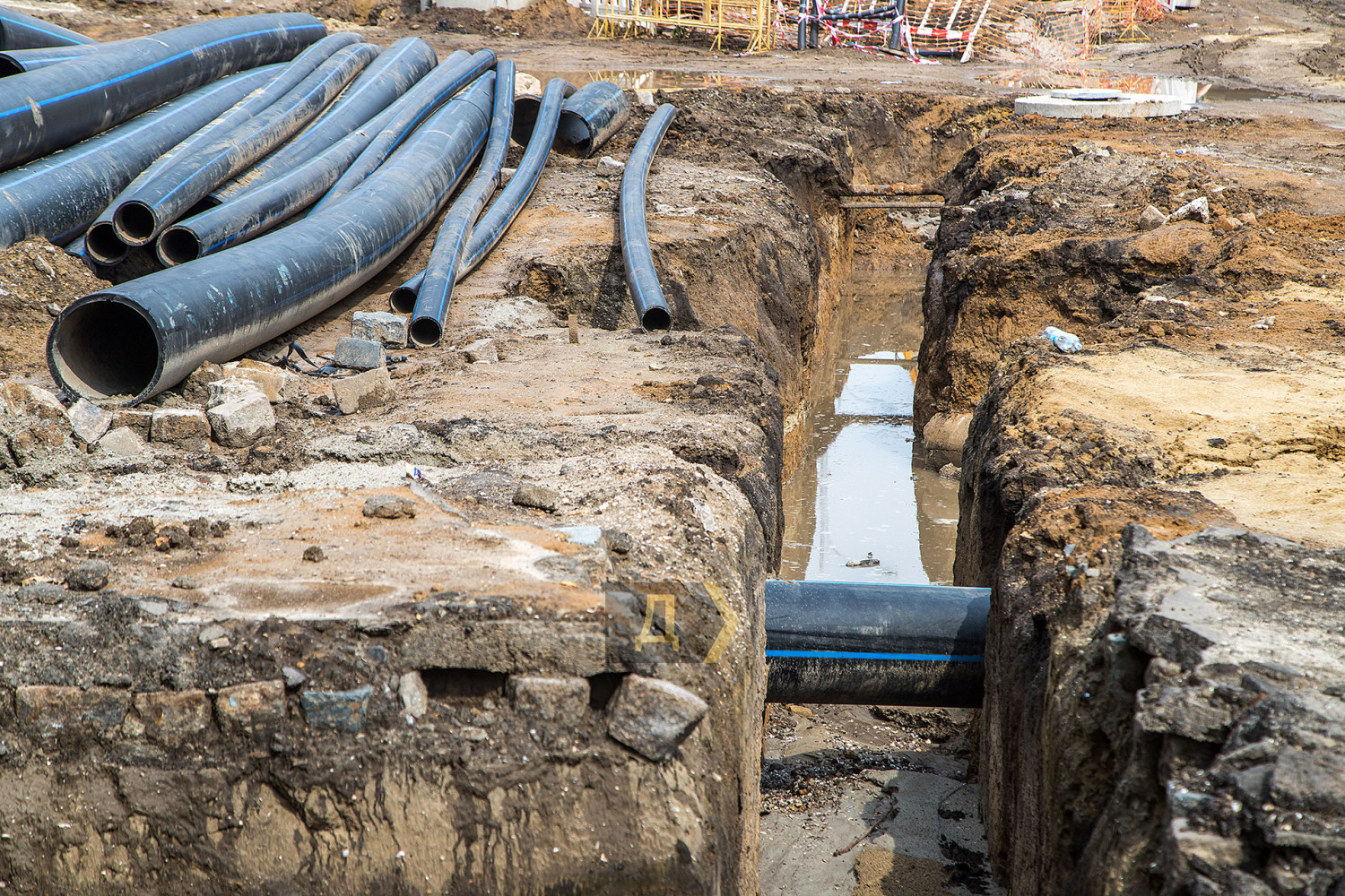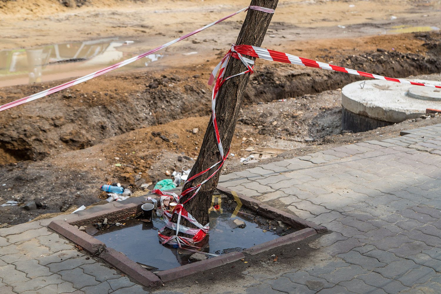 Как передает наш корреспондент, в коммуникационных траншеях стоит вода, а работы временно остановлены — строительная техника ждет начала работ на обновленном участке Новощепного Ряда в районе старого входа в зоопарк.