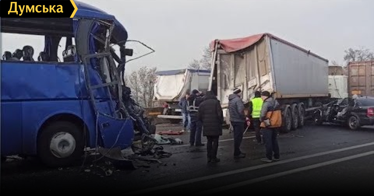 Возле посёлка Дачное из-за неблагоприятных погодных условий друг за другом столкнулись 11 транспортных средств. Водитель автобуса «Автолюкс» погиб на месте. Один из пострадавших находится в коме.