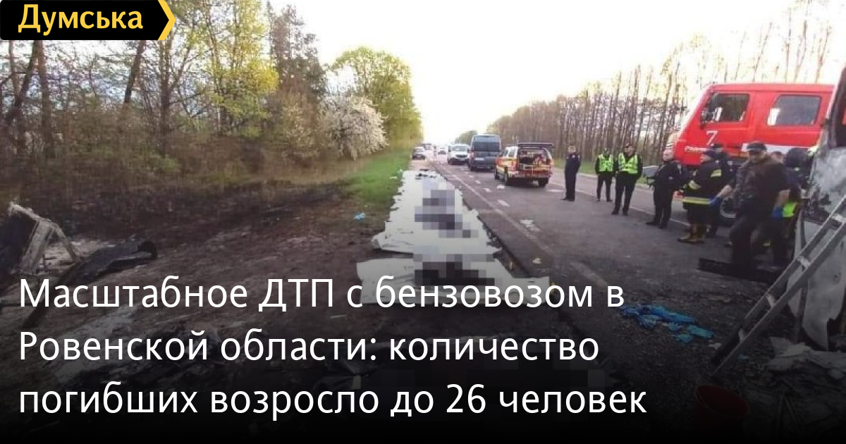 Масштабное ДТП с бензовозом в Ровенской области: количество погибших возросло до 26 человек26 человек погибли и 12 получили травмы в результате ДТП с участием бензовоза, которое произошло вечером 3 мая на автодороге Киев-Чоп в районе села Ситное Дубенского района Ровенской области. Как сообщили в пресс-службе Национальной полиции Украины, среди погибших — 24 пассажира и двое водителей (микроавтобуса и автобуса). Правоохранители завершают осмотр места происшествия и идентифицируют погибших. Анкетные данные трех человек пока не установлены. Предварительно установлено, что водитель микроавтобуса Mercedes-Benz Vito, обгоняя машину, выехал на встречную полосу, где столкнулся с бензовозом. Личность погибшего водителя микроавтобуса пока не установлена. На момент ДТП в салоне автобуса Setra, который направлялся в Польшу, находились 34 пассажира и один водитель. Выяснилось, что еще один пассажир должен был садиться в городе Броды, а второй водитель — во Львове. Все пассажиры — в возрасте от 17 до 69 лет. Младшему 12 мая должно было исполниться 18 лет. Это жители Житомирской, Киевской, Черниговской, Харьковской и Хмельницкой областей. Заметили ошибку? Выделяйте слова с ошибкой и нажимайте control-enter |