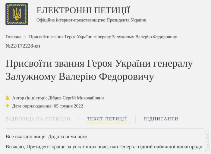 У найближчі три місяці ця петиція має набрати 25 тисяч голосів, і після цього питання буде передано на розгляд Президента. На відміну від безлічі інших, питання вручення державних нагород перебувають повністю в його повноваженнях. Якщо ви вважаєте Валерія Залужного гідним цієї нагороди — приєднуйтесь до нашої петиції. Авторизуватися можна через банківські додатки, за допомогою ЕЦП або через «Дію». Ваш підпис не лише стане свідченням поваги до нашого видатного воєначальника, а й нагадає голові держави про доцільність нагородження. Переходьте за посиланням та підписуйте петицію просто зараз: https://petition.president.gov.ua/petition/172228