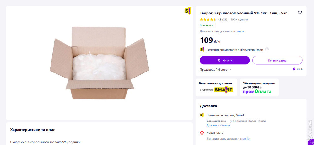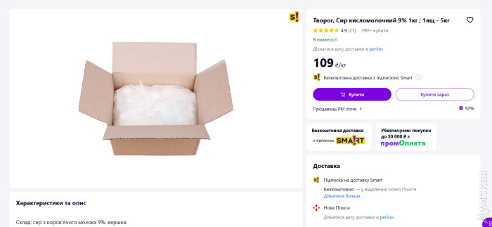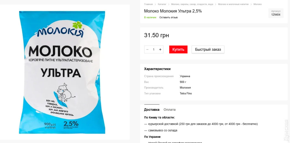 Дальше — молочные продукты, где аппетиты поставщика растут. Творог (9%) закупили по 184,25 грн за кило (22 110 грн за центнер), хотя его реальная цена — 109. Почти двойная наценка! Похожая история и с молоком «Молокия» (2,5%): за пакет объемом 900 г громада платит 49,50 грн, тогда как в магазине оно стоит 31,5.