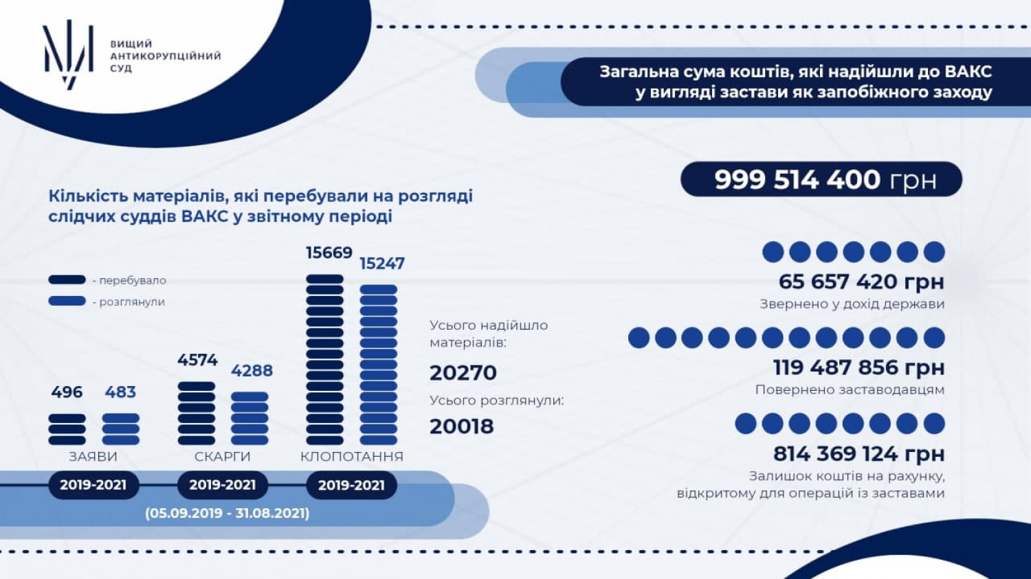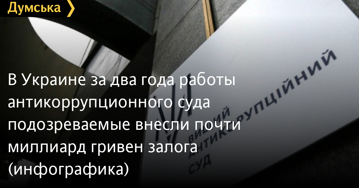 В Украине за два года работы антикоррупционного суда подозреваемые внесли почти миллиард гривен залога (инфографика)Почти миллиард гривен поступили на счет Высшего антикоррупционного суда в виде залога как меры пресечения от подозреваемых в совершении преступлений. Соответствующую инфографику опубликовали в ВАКСе по случаю второй годовщины запуска судебной инстанции. Из 999 млн 514 тыс. 400 гривен залога в доход государства перешли 65 млн 657 тыс. 420 гривен. Почти 119,5 млн вернули залогодателям, а более 814 млн гривен остаются на залоговом счете суда. Антикоррупционный суд заработал в начале сентября 2019 года. Его создания требовали западные партеры и МВФ. Необходимый закон был принят летом 2018 года, а конкурсный отбор судей завершился весной 2019 года. По состоянию на 31 августа 2021 года в ВАКС поступило более 20 тысяч материалов. СМЕРТЬ РОССИЙСКИМ ОККУПАНТАМ! Заметили ошибку? Выделяйте слова с ошибкой и нажимайте control-enter |