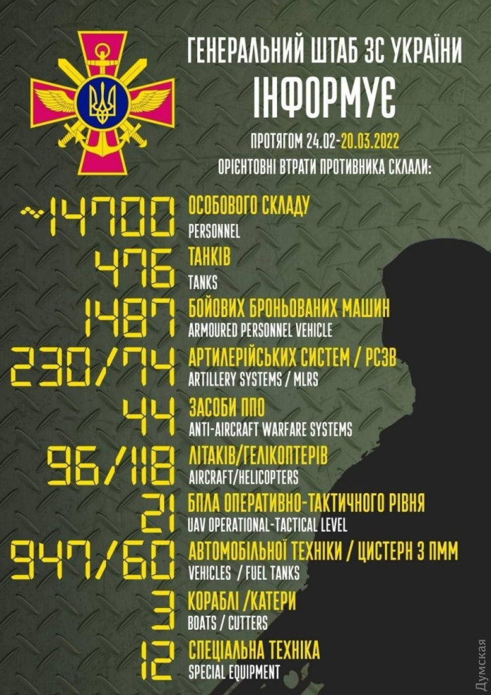 Двадцать пятый день российского вторжения в Украину: противник продолжает нести потери и стягивает резервыПродолжается открытое нападение РФ на Украину, которое Путин начал 24 февраля в 5 утра. Хроника вчерашнего дня боев по ссылке. ОБНОВЛЕНО В 23:05. 20 марта из семи согласованных гуманитарных коридоров сработали четыре. По ним удалось эвакуировать 7295 человек. Об этом сообщила вице-премьер-министр Ирина Верещук. Из Мариуполя в Запорожье сегодня прибыли 3985 человек 11 автобусами из Бердянска и частным автотранспортом. Завтра для эвакуации мариупольцев в Бердянск планируют направить около 50 автобусов. В Киевской области из села Бобрик в Бровары удалось эвакуировать две тысячи человек. Из села Тарасовка в Бровары эвакуировали 1310 человек. Из города Бородянка в Белую Церковь эвакуация была в очередной раз сорвана из-за нарушения режима тишины оккупантами. Из Харькова удалось доставить гуманитарную помощь в поселок Рогань. Доставка гуманитарной помощи в поселок Малая Рогань была сорвана. Гуманитарная колонна для города Вовчанск была захвачена оккупантами. На сегодняшний день нет связи с пятью людьми, доставлявшими гуманитарный груз – пятью водителями и врачом. По имеющейся информации, они находятся в плену. ОБНОВЛЕНО В 21:37. Украинские защитники ликвидировали командира разведывательной роты 11-го мотострелкового полка 1-го армейского корпуса так называемой «ДНР» капитана Сергея Машкина, сообщает командование Оперативно-тактической группировки «Восток». ОБНОВЛЕНО В 20:15. Оперативную информацию о двадцать пятых сутках героического противостояния Украинского народа российскому военному вторжению обнародовал Генеральный штаб ВС Украины. Оккупационные войска потеряли наступательный потенциал, их продвижение остановлено почти во всех направлениях. Враг продолжает проводить скрытую мобилизацию в некоторых районах, однако население не желает участвовать в войне. Также сообщается о достигнутых договоренностях российских нацистов о направлении ливийских «добровольцев» в Украину. Продолжается мобилизация на временно оккупированных территориях Луганской и Донецкой областей. Руководство техникумов, институтов вызывает студентов в возрасте от 18 лет для так называемой регистрации. В Херсоне оккупанты приступили к замене военных подразделений на подразделения росгвардии и полиции российских нацистов. Во время осуществления очередной неудачной попытки наступления на Киев боевики потеряли сводный отряд 6-го танкового полка. Кроме того, в отдельных направлениях в Броварском районе подразделения противника остаются отрезанными от поставки топлива и продовольствия. ОБНОВЛЕНО В 19:02. Президент Украины Владимир Зеленский выступил перед Кнессетом — парламентом Израиля. Подробнее по ссылке. ОБНОВЛЕНО В 18:45. Частичную ротацию персонала удалось провести на Чернобыльской АЭС, захваченной российскими нацистами, сообщает пресс-служба Государственного специализированного предприятия в Facebook. Частичная ротация и эвакуация лиц, находившихся на территории оккупированной станции, была проведена в конце дня 20 марта. За этот день удалось вывезти 64 человека. ОБНОВЛЕНО В 17:43. Президент Украины, Верховный главнокомандующий ВС Украины Владимир Зеленский ввел в действие решение Совета национальной безопасности и обороны Украины «О реали