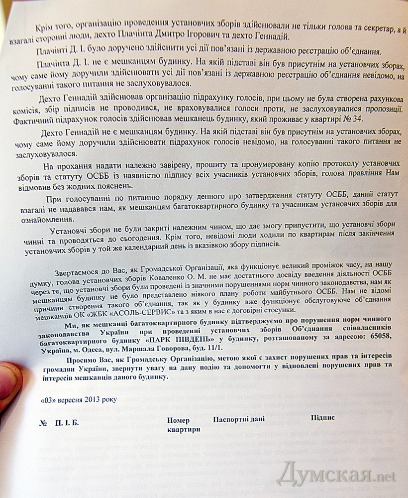 Одесса: сразу две организации борются за право обслуживать высотку у парка ПобедыВ доме №11/1 по улице Маршала Говорова, который неоднократно упоминался в связи с застройкой дендропарка Победы, возник еще один конфликт. Жильцы многоэтажки разделились на два противоборствующих лагеря — соответственно числу обслуживающих контор, алчущих этой самой многоэтажкой домоуправлять. До весны этого года дом обслуживала строительная компания «Ассоль», которая его и возводила. Но потом застройщику это надоело, и он передал бразды обслуживания неприбыльной организации «Ассоль-строй». Председатель последней Елена Майстренко рассказала «Думской», что за полгода работы новый кооператив успел заключить договора более чем с 60 жильцами, взвалить на себя их общий долг в 183 тысячи гривен и наладить работу со всеми поставщиками коммунальных услуг. Однако в прошлом месяце по инициативе одного из жильцов — Александра Коваленко — было создано ОСМД «Парк Юг». Также за это объединение совладельцев выступили двое молодых людей — Олег и Геннадий, которые представились «членами общественной организации, занимающейся защитой прав инвесторов одесских недостроев». По словам Елены Майстренко, учредительное собрание, участники которого чуть ли не единогласно поддержали создание ОСМД, проводилось с многочисленными нарушениями. «Во-первых, у них не было необходимого кворума, так как голосовать должны не только жильцы, но и наниматели жилой и нежилой площади в здании, включая даже владельцев парковочных мест в подземном паркинге. Дошло до вопиющих фактов, когда в голосовании и подсчете голосов принимали участие люди, не имеющие вообще никакого отношения к нашему дому, — заявил она. — Многие жильцы дома даже не знали о проведении этого собрания, часть подписей, как мы считаем, просто подделали». Тем временем некоторые жильцы опасаются, что смена обслуживающей организации ударит по их кошелькам. «Работа новой структуры приведет только к ухудшению услуг и повышению цен, они ведь для этого и создают ОСМД, чтобы цены повысить», — уверен 65-летний житель дома Владимир Шурдук. Как доказательство того, что происходящие изменения волнуют большинство жильцов, председатель кооператива передала журналистам обращение в общественную организацию «За справедливость и закон» и судебный иск с требованием признать недействительными результаты учредительного собрания. Следующим шагом жильцы называют обращение в прокуратуру по факту фальсификации подписей и уставных документов. СМЕРТЬ РОСІЙСЬКИМ ОКУПАНТАМ! Помітили помилку? Виділяйте слова з помилкою та натискайте control-enter |