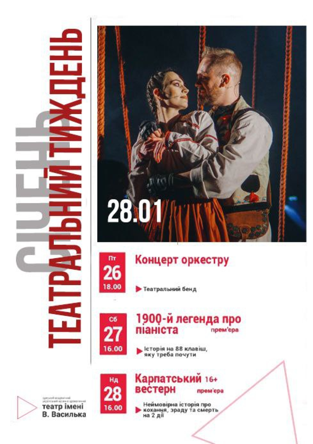 «Джаз», історія піаніста та «Карпатський вестерн»: що подивитися в Українському театрі (суспільство)Новий тиждень — нові можливості подивитися цікаві та оригінальні вистави в улюбленому Українському театрі. Три несхожі спектаклі чекають на найвимогливішого глядача, тож плануємо разом, а квитки можна купити тут! Концерт оркестру театр «Джаз» 26 січня 18:00 Шанувальники джазу добре знають, чому не варто пропускати виступи Театрального бенду в українському театрі. По-перше, тому, що це завжди сучасне звучання, чи то нові авторські твори, чи аранжування вже відомих пісень. По-друге, колектив і його репертуар створено відомим українським джазовим піаністом Вадимом Бессарабом. По-третє, в аранжуваннях активно використовуються етнічні українські інструменти. У програмі концерту твори Б. Еванса, С. Ролінза, Д. Хейсена, A. Вайлдерa, М. Паліца, А.Раміреза, В. Бессараба Додайте джазу у своє повсякдення! Історія на 88 клавіш, яку треба почути «1900-й. Легенда про піаніста» 27 січня 16:00 Неочікувана, дивовижна і драйвова постановка головного режисера театру – Олександра Самусенка, де виконавець ролі Новеченто (1900-ого) – Вадим Бессараб, якого одесити знають як віртуозного піаніста, наживо виконуватиме адаптовані ним упізнавані музичні твори на роялі в безпосередній близькості до глядача. Зауважте: залишилося зовсім мало квитків Неймовірна історія про кохання, зраду та смерть на дві дії «Карпатський вестерн» 28 січня 16:00 Чи можливий справжній вестерн, якщо навколо не Дикий Захід, а вкриті смереками Карпати?! Звісно! Запрошуємо вас переконатися у цьому на власні очі! Усі принади вестерну з українським колоритом: яскравий екшн, карколомна детективна історія, моторошний трилер та по-справжньому смішна комедія – усе це в пізнаваних реаліях і з близькими персонажами, де замість ковбоїв на конях ганятимуть зухвалі леґені, які підкорюють не дику пустелю, а здичавілі гірські ліси з духами предків. А от банда підступних розбійників буде класична! Ба навіть червоношкірий індіанець справжній буде! І відтяті скальпелі теж! І все це під запальну живу музику, веселі співи й сучасну хореографію! СМЕРТЬ РОСІЙСЬКИМ ОКУПАНТАМ! Помітили помилку? Виділяйте слова з помилкою та натискайте control-enter |