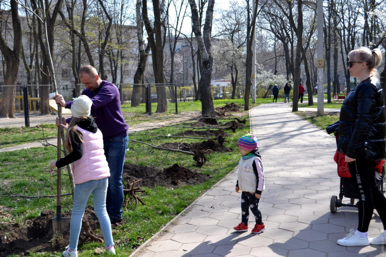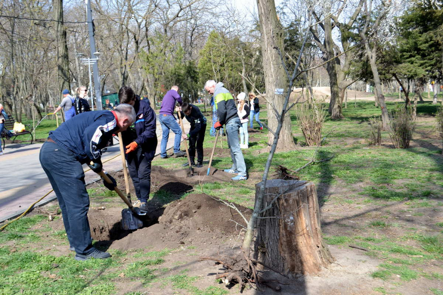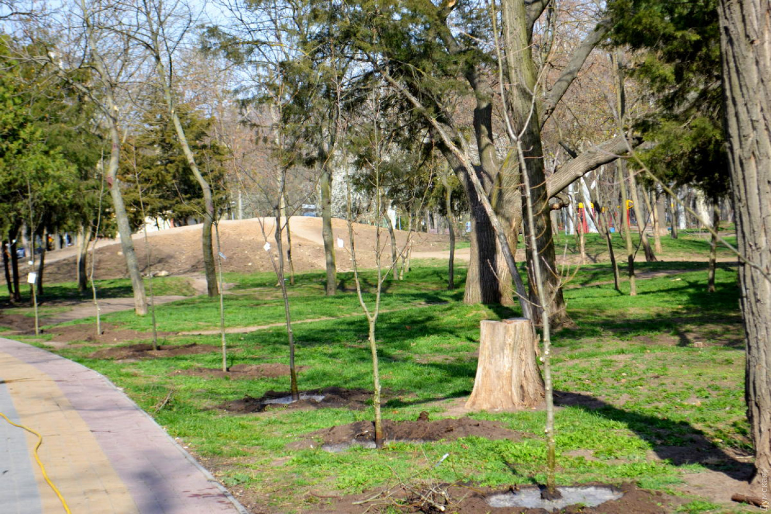 Пенек выкорчевать нужно было, иначе новые деревья расти не будут. Подальше от аллеи сажать. И не так густо. Вроде бы и отличная инициатива, но какое-то бестолковое исполнение…
