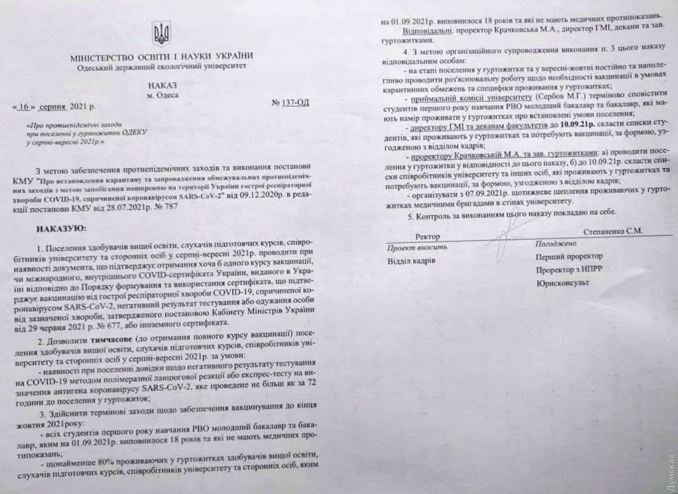 Экологический университет усиливает противоэпидемические меры: в общежития заселяют по справке о вакцинации или негативному тестуРектор Одесского государственного экологического университета Сергей Степаненко утвердил противоэпидемические меры при заселении в общежития в августе-сентябре 2021 года. В соответствии с приказом ректора, заселять в общежития будут при наличии негативного ПЦР-теста на COVID-19, полученного в течение последних 72 часов, справки о выздоровлении от этой болезни или документа, который «подтверждает получение хотя бы одного курса вакцинации». Копию приказа обнародовала доцент ОНУ им. Мечникова, адвокат Виктория Валах, которая специализируется на защите прав пациентов. Ректор ОГЭУ подтвердил факт издания такого документа. Как следует из приказа, лиц с негативным ПЦР поселят временно, до получения полного курса вакцинации. Также ректор приказал привить всех первокурсников поголовно и 80% остальных лиц, которые проживают в общежитиях, а также «настойчиво проводить разъяснительную работу о необходимости вакцинации». Адвокат Валах заявляет о незаконности данного приказа и готовится представлять интересы клиентов, несогласных с такими требованиями. Действительно, положение о пользовании общежитиями утверждено приказом министерства. Согласно документу, заселение в общежитии проводится на основании заявления. Предоставление каких-либо других документов приказом не предусмотрено, а студенты подлежат профилактическим медицинским осмотрам. Закон Украины «О защите населения от инфекционных болезней» не предусматривает обязательную вакцинацию от болезней, которые не включены в Календарь, а при ухудшении эпидемической ситуации позволяет проводить внеочередные медосмотры по решению главного государственного санитарного врача. Отметим, что в Постановлении главгоссанврача Украины №49, которым утверждены противоэпидемические мероприятия в общежитиях в период карантина, о прививках не сказано ни слова. Безусловно, университет имеет право разрабатывать собственные правила пользования общежитием, но они не могут ограничивать права и устанавливать дополнительные обязанности для студентов. Не менее сомнительный данный приказ и с точки зрения эффективности, считает врач-эпидемиолог Борис Панфилов. «Коронавирус справок не боится, и тем более не страшны ему справки о негативном ПЦР три дня назад», — говорит он. По мнению специалиста, требования к заселяющимся в общежитии бездумно списаны с правил пересечения границ, и они никак не обеспечат защиту от заноса инфекции во время учебы. По его мнению, вспышки COVID-19 в общежитиях и в студенческих группах несомненно будут происходить: «Единственный эффективный способ противодействия — не открывать их вообще и полностью перейти на удаленное обучение». Панфилов предупреждает, что готовиться нужно не только к росту заболеваемости коронавирусом. «Страна уже второй сезон находится в карантине. Люди разобщены, мало общаются, кое-как, но все-таки носят маски и соблюдают дистанцию. А это значит, что уменьшилась естественная передача возбудителей, и иммунитет ко многим болезням «просел». Люди съедутся с разных областей и из-за границы, и привезут в общежития новые штаммы разных инфекций», — считает врач. По его мнению, нужно быть готовыми к массовому распростр