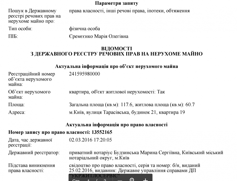Весной 2016 года Мария Еремеенко получила на себя и своего сына Андрея квартиру на улице Тарасовской в Киеве. Свидетельство о праве собственности выдало ГП «Укржилсервис». Площадь квартиры 117 квадратных метров, следовательно норма расчета жилплощади (13,65 кв.м на человека) в данном случае превышена больше чем в два раза.