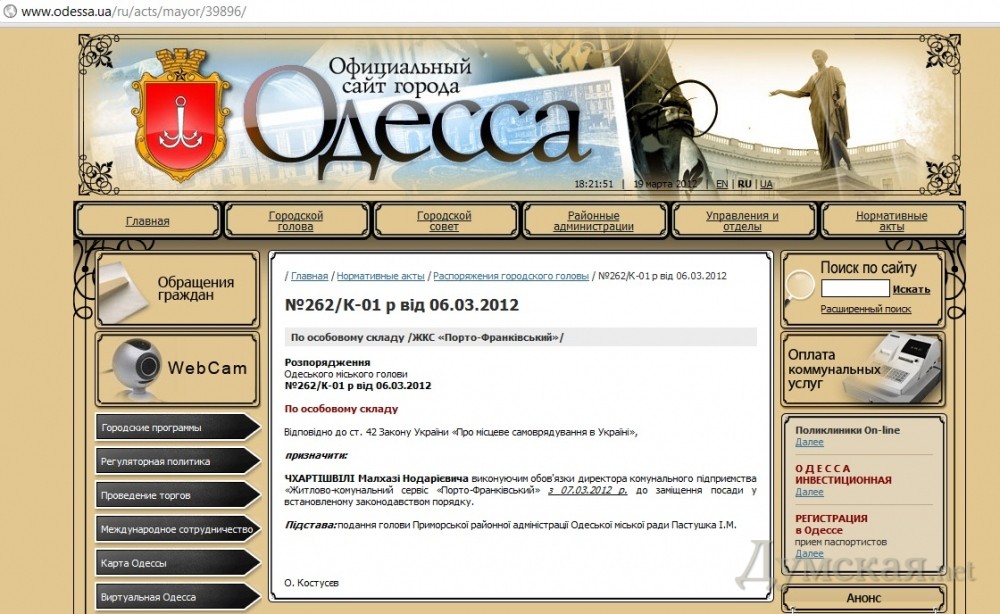 Пока что г-н Чхартишвили наплевал с большой колокольни на решение исполкома об оптимизации численности в ЖКСах ещё от лета 2011 года, подписанное мэром, и имел в виду протокол поручений, подписанный Орловским о сокращении работников ЖКС! Оказывается, на следующий день после объявления себя местоблюстителем новый ставленник Пастушка вернул всех сокращённых при прежнем руководстве на старые должности! И это при том, что в результате проверки УЖКХ признало законность сокращения количества участков! Куда смотрят Орловский с Козловским?
