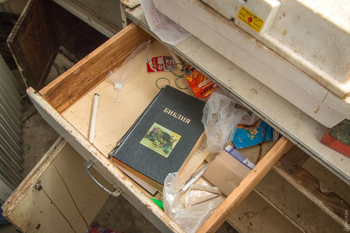 Условия работы в хозяйственной части, мягко говоря, далеки от идеальных: мусор, грязь, обшарпанные стены. Хозяйственные помещения, в том числе и те, где часто находился предполагаемый убийца, мало чем отличаются от загонов для свиней. Все захламлено. Библия, которая лежала в столе, соседствует с бытовыми отходами.