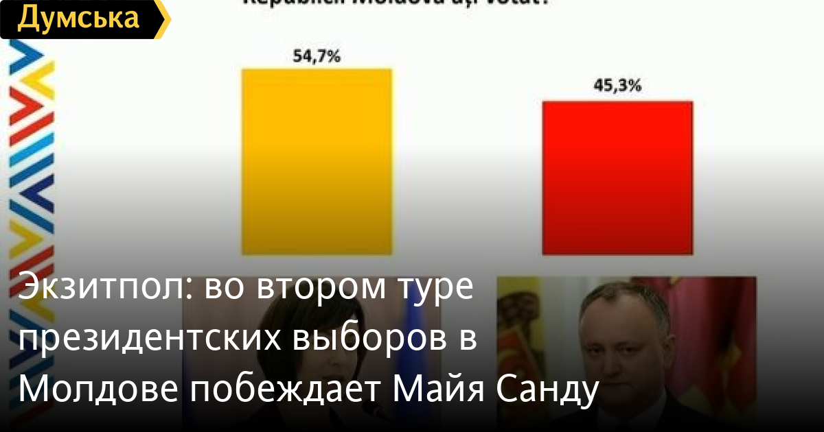 Во втором туре президентских выборов, который сегодня состоялся в Молдове, согласно данным экзитполов, побеждает Майя Санду. Об этом сообщает РБК. Так, согласно данным WatchDog, Санду набирает 54,7% голосов, а Игорь Додон — 46,3%. Результаты экзитпола Intellect Group (совместного с ассоциацией SPERO) показывают, что за Санду отдали свои голоса 54,8% избирателей, а за Додона — 45,2%. Отмечается, что оба опроса не учитывают голоса диаспоры и жителей Приднестровья. После завершения голосования оба кандидата уже успели выступить с заявлениями. Санду акцентировала внимание на высокой явке на зарубежных участках. «Наши граждане сегодня показали, что как бы далеко они не находились, им не все равно, что происходит дома», — отметила она. При этом действующий президент Игорь Додон, который считается одним из самых пророссийских политиков на постсоветском пространстве, заявил о своей уверенной победе. «Закрываем этот этап и идем дальше. Благодарю, что были активными и голосовали за президента. Явка рекордная. По нашим оценкам, мы с большим отрывом идем внутри страны», — подчеркнул политик. Он также намекнул, что не считает честными результаты голосования за рубежом и рассматривает возможность их обжалования. Стоит отметить, что ранее Додон призывал своих сторонников выйти 16 ноября на улицы, чтобы защищать его победу на выборах. Напомним, что прозападная Санду обошла Додона и в первом туре, но с небольшим разрывом в 4% голосов. СМЕРТЬ РОССИЙСКИМ ОККУПАНТАМ! Заметили ошибку? Выделяйте слова с ошибкой и нажимайте control-enter |