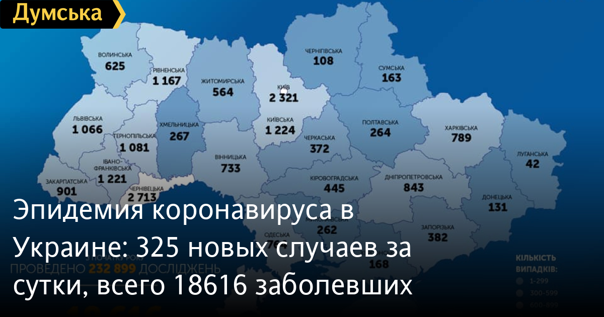 Эпидемия коронавируса в Украине: 325 новых случаев за сутки, всего 18616 заболевшихПо состоянию на 9 утра 18 мая в Украине лабораторно подтверждено 18616 случаев коронавирусной инфекции. Об этом сообщила пресс-служба Центра общественного здоровья МОЗ. За минувшие сутки в стране зафиксировано 325 новых случаев заболевания. На сегодняшний день в Украине от COVID-19 умерли 535 пациентов, а полностью излечились 5276. Заболеваемость по областям: Винницкая – 733 Волынская – 625 Днепропетровская – 843 Донецкая – 131 Житомирская – 564 Закарпатская – 901 Запорожская – 382 Ивано-Франковская – 1221 Кировоградская – 445 Киевская – 1224 Львовская – 1066 Луганская – 42 Николаевская – 262 Одесская – 764 Полтавская – 264 Ровненская – 1167 Сумская – 163 Тернопольская – 1081 Харьковская – 789 Херсонская – 168 Хмельницкая – 267 Черновицкая – 2713 Черкасская – 372 Черниговская – 108 Киев – 2321 СМЕРТЬ РОССИЙСКИМ ОККУПАНТАМ! Заметили ошибку? Выделяйте слова с ошибкой и нажимайте control-enter Новости по этой теме: 4 марта 2023: "Вакцини-довгожителі", або Як щеплення проти COVID-19 перетворилися в Україні на небезпечний ритуал 27 января 2023: МОЗ обязали опубликовать договоры на закупку вакцин против COVID-19: апелляционный суд удовлетворил иск журналиста "Думской" 11 января 2023: За неделю в Одессе зафиксировано 159 случаев ковида 4 января 2023: За неделю в Одессе зарегистрировано 113 случаев ковида |