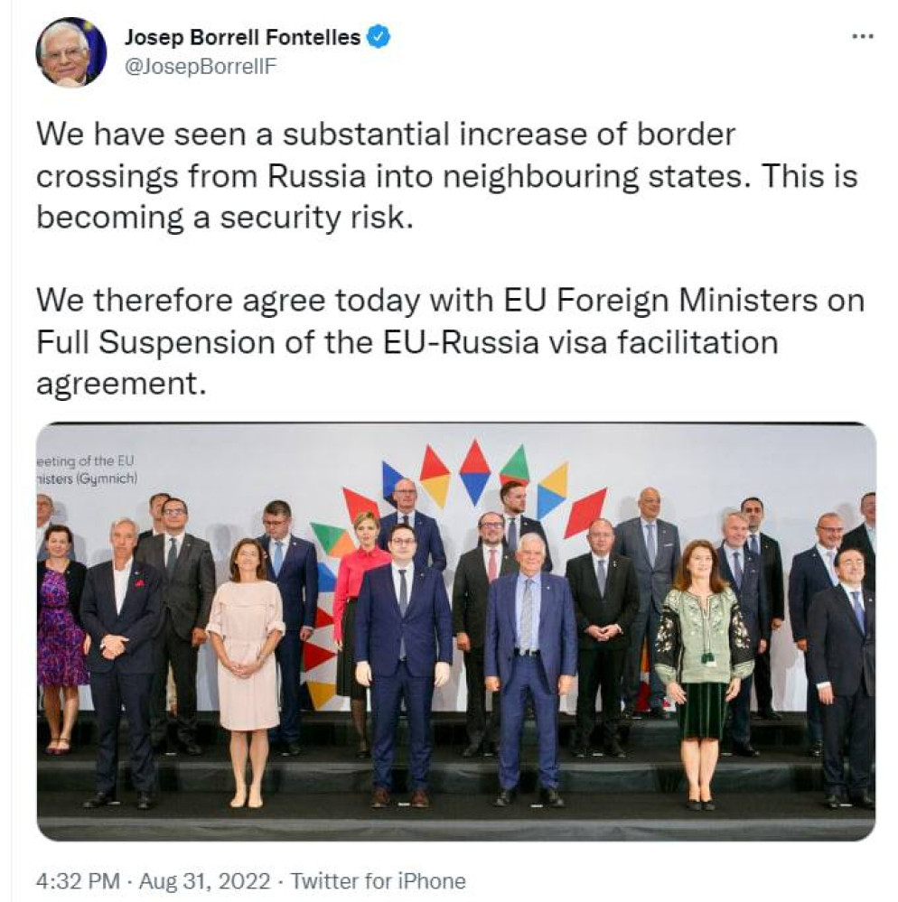 «Ми спостерігаємо значне збільшення перетину кордону з росії до сусідніх держав. Це стає загрозою безпеці», — заявив голова європейської дипломатії Жозеп Боррель. Він також уточнив, що Єврокомісія підготує рекомендації щодо того, що країнам ЄС робити з уже виданими росіянам візами.