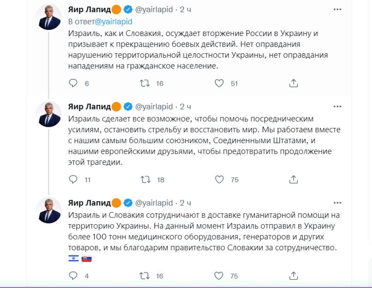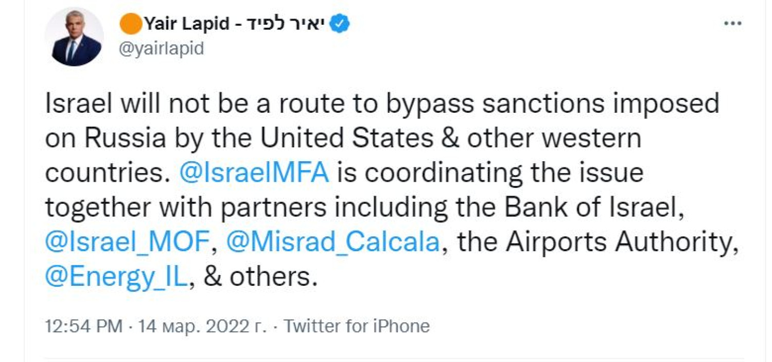 «Эта война должна прекратиться»: Израиль анонсировал возможные санкции против РФМинистр иностранных дел Израиля Яир Лапид заявил, что страна осуждает вторжение России в Украину и призывает к прекращению боевых действий. Как сообщил дипломат на своей странице в Twitter, Израиль не станет путем обхода санкций, наложенных на Россию США и другими странами. «МИД Израиля согласовывает вопросы вместе с партнерами, включая Банк Израиля, министерство финансов, министерство экономики и промышленности, управление аэропортов, министерство энергетики и другие», — написал Лапид. Он подчеркнул, что нарушению территориальной целостности страны и убийствам мирного населения не может быть оправданий.