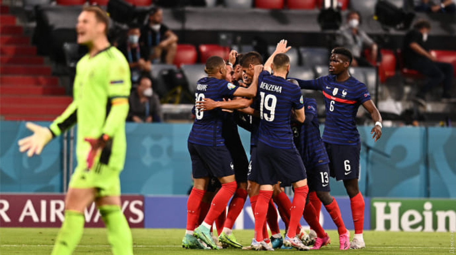 Сборная Франции в первом туре чемпионата Европы по футболу с минимальным счетом переиграла команду Германии, Португалия одолела венгров. Матчи прошли во вторник 15 июня в немецком Мюнхене и венгерском Будапеште, сообщает «Украинская правда». Первый тайм битвы грандов на Евро-2020 чемпионы мира выиграли и по счету, и по моментам. У Бундестим не было ни одного удара в створ ворот. У Франции еще до забитого мяча был момент, но на месте оказался Мануэль Нойер. На 20 минуте Франция повела в счете. После прострела с фланга от Люка Эрнандеса Матс Хуммельс срезал мяч в собственные ворота, оформив автогол. Германия в атаке не выглядела агрессивной, и были только удары мимо ворот без обострения в штрафной соперника. Второй тайм немецкая команда сыграла лучше, но Франция все равно имела больше моментов у ворот Нойера. На старте заключительной 45-минутки у Германии был наиболее реальный момент сравнять счет. Впрочем, после удара Сержа Гнабри метров с 12-ти мяч пролетел чуть выше перекладины ворот. Адриен Рабьо имел возможность довести счет до 2: 0, но после его удара мяч попал в штангу ворот. Французы еще дважды забивали во втором тайме, но голы Мбаппе и Карима Бензема были отменены из-за положения вне игры, которые четко показал ВАР. В добавленные шесть минут к основному времени немцы до последнего сражались у штрафной Франции, но завершающий удар так и не нанесли. В другом матче группы F Португалия сумела в последние 15 минут разгромить Венгрию со счетом 3:0. Дубль в этой встрече оформил Криштану Роналду. С 11-ю мячами Роналду стал лучшим бомбардиром в истории чемпионатов Европы, обойдя Мишеля Платини, у которого было девять голов. СМЕРТЬ РОССИЙСКИМ ОККУПАНТАМ! Заметили ошибку? Выделяйте слова с ошибкой и нажимайте control-enter Новости по этой теме: 17 июня 2024: Еврошок: сборная Украины по футболу стартовала с сокрушительного поражения на Чемпионате Европы 16 июня 2024: Игрок одесского "Черноморца" в составе олимпийской сборной Украины по футболу получил золото престижного турнира |