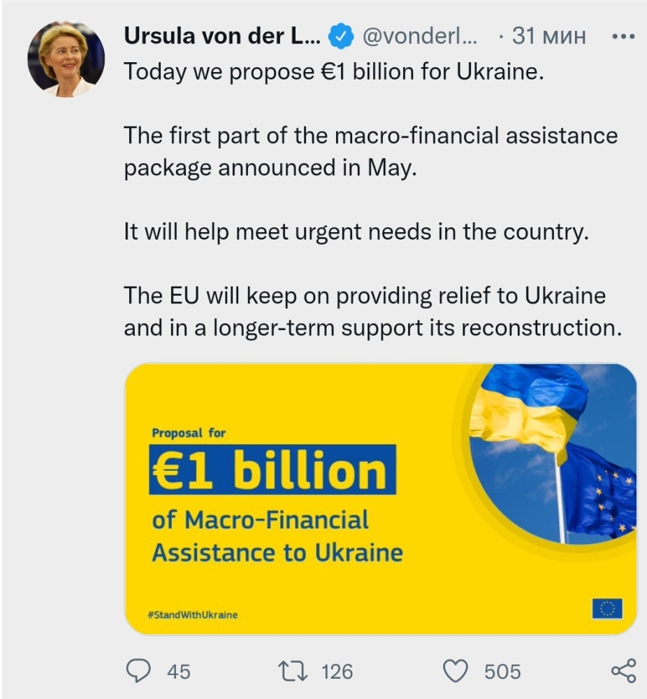 Еврокомиссия предложила выделить Украине первый транш экстренной макрофинансовой помощи в размере 1 млрд евро. Об этом в Твиттере сообщила председатель Европейской комиссии Урсула Фон дер Ляйен. «Это поможет удовлетворить неотложные потребности страны. Евросоюз продолжит оказывать помощь Украине и будет поддерживать ее восстановление в долгосрочной перспективе», — подчеркнула руководитель Еврокомиссии. Теперь решение должен утвердить Совет Европейского союза. СМЕРТЬ РОСІЙСЬКИМ ОКУПАНТАМ! Помітили помилку? Виділяйте слова з помилкою та натискайте control-enter |