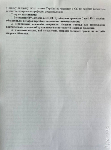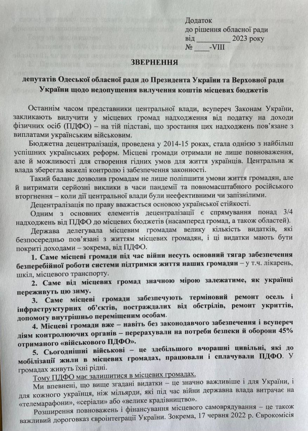 Звернення на адресу президента України та Верховної Ради з проханням не забирати у місцевих бюджетів кошти, що надходять від податку на доходи фізичних осіб (ПДФО), підготувала фракція «Європейської Солідарності» в Одеській облраді.