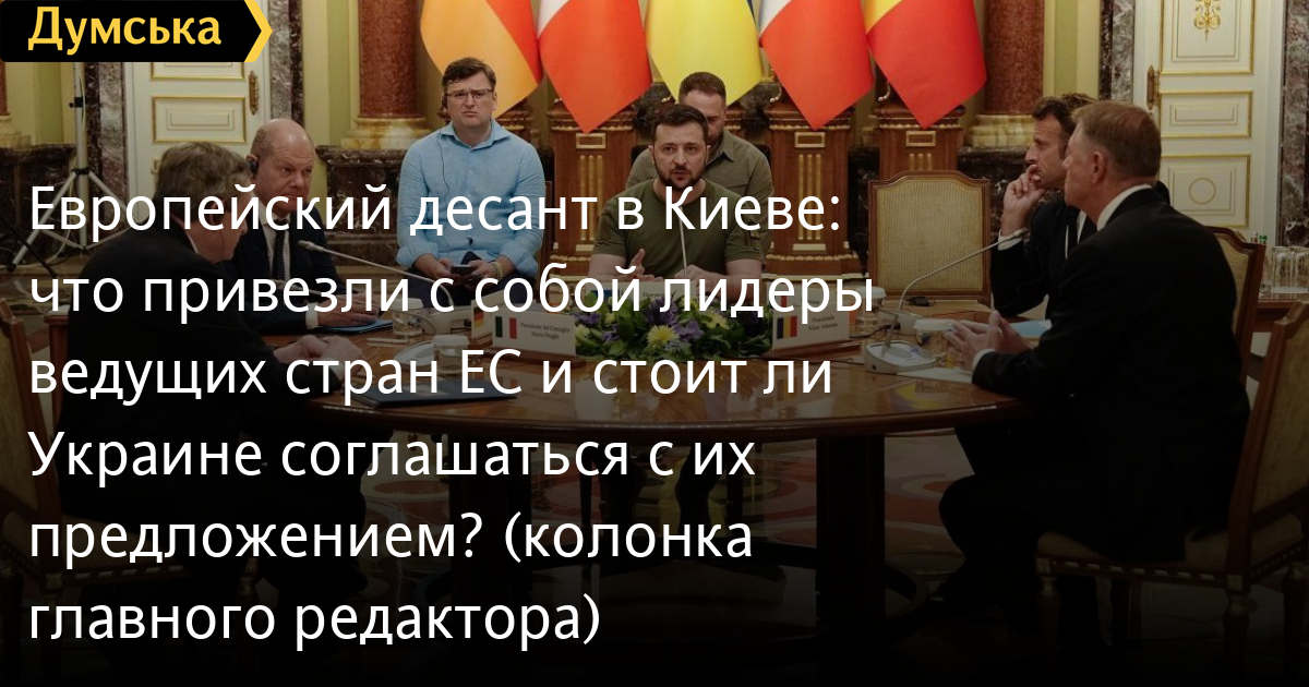 «Европейский десант» в Киеве: что привезли с собой лидеры ведущих стран ЕС и стоит ли Украине соглашаться с их предложением? (колонка главного редактора)Главная новость сегодняшнего дня — визит в Украину лидеров сразу четырех государств: президента Франции Эмманюэля Макрона, канцлера Германии Олафа Шольца, премьер-министра Италии Марио Драги и президента Румынии Клауса Йоханниса. Они побывали в освобожденном от российских нацистов Ирпене, где ознакомились с многочисленными свидетельствами военных преступлений, совершенных оккупантами. Сделали несколько заявлений, суть которых сводится к тому, что западные страны по-прежнему едины в своем стремлении помогать Украине, ужасаются варварству россиян и восхищаются мужеством нашего народа. Еще гости высказались в поддержку предоставления Украине статуса кандидата в члены ЕС (что, кстати, ничего не значит, поскольку кандидатом можно быть десятилетиями — как, скажем, все еще ждет полноценного членства Турция). После этого они провели встречу с украинским президентом. Беседа проходила за закрытыми дверями. Руководитель офиса главы государства Андрей Ермак рассказал журналистам, что в ходе встречи Зеленский передал коллегам пакет украинских санкционных предложений. Также известно, что стороны обсудили вопросы снятия морской блокады и послевоенного восстановления Украины. Однако главным, как мне кажется (и не только мне), было не это. Главной темой встречи наверняка было возобновления диалога с Москвой. Собственно, то, что она как минимум присутствовала в повестке дня, публично заявляют сами участники беседы. Скажем, Эмманюэль Макрон: «Мы всегда поддерживаем вариант диалога, потому что в один прекрасный день конфликт должен прекратиться и должны начаться переговоры. Но условия переговоров должны быть определены Украиной: Франция и Германия никогда не будут посредниками за спиной Украины и никогда не будут выставлять Украине условий», — сказал французский лидер, добавив, что Франция и Германия могут участвовать в этом процессе как гаранты безопасности нашей страны. Тем не менее наблюдатели полагают, что условия все же есть, точнее предложение и европейцы увязали этот вопрос (переговоров со страной-агрессором) с перспективами членства Украины в ЕС. Иными словами, хотите в Европу — договаривайтесь с путиным. Если гости, действительно, приехали с таким предложением, то это объясняет состав сегодняшнего «европейского десанта». Во-первых, Франция, Германия и Италия («большая европейская тройка») никогда особо не скрывали, что выступают именно за политическое решение — хотя бы временное. Именно из столиц этих ключевых европейских государств неоднократно звучали призывы «дать путину возможность сохранить лицо», «не загонять его в угол», а Италия даже разработала мирный план, который предполагает целый ряд уступок со стороны Украины. А еще они уже не скрывают, что договорились между собой не поставлять нам определенные виды вооружения — танки или самолеты. Чтобы, значит, не злить российского диктатора (очень дурно пахнущие договоренности на фоне открытых переговоров в Рамштайне). И одновременно эти страны с самого начала полномасштабной агрессии довольно благосклонно смотрели на евроустремления Киева — в отличие от Нидерландов или Венгрии. Поддастся ли Зеленский на у