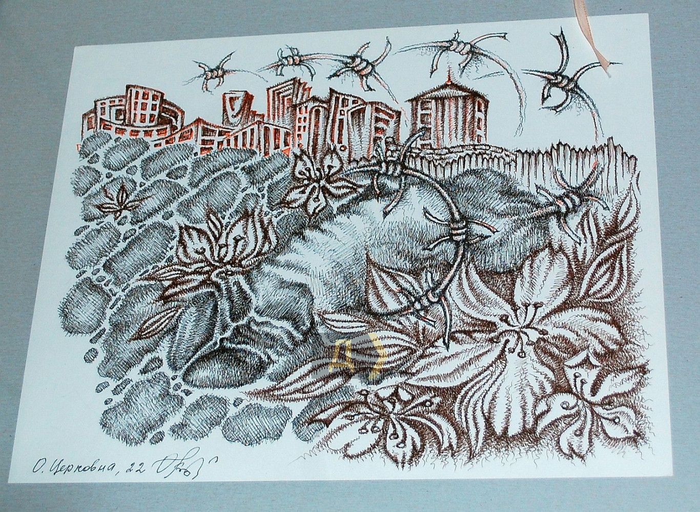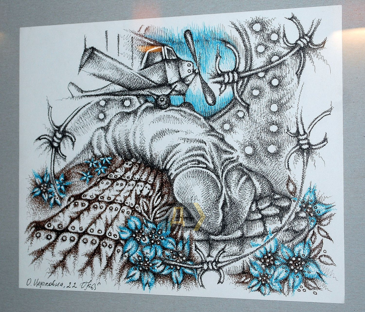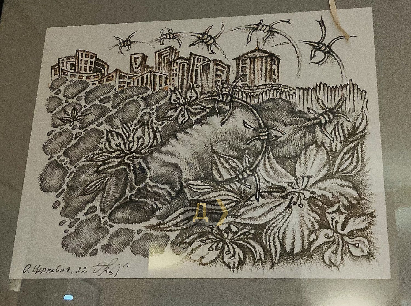 Тіло як ландшафт – метафора, що віддзеркалюється у творах через переплетіння природних форм і архітектури. Шрами нагадують про історичні події, а текстури підкреслюють життєві переживання. Тіло водночас особисте і колективне, інтимне і суспільне і несе в собі досвід, який можливо відчути на глибшому рівні». Інтимність – це завжди гра між відкриттям і закриттям, між допуском і захистом, нагадує мисткиня. Колючий дріт – метафора заборон, символ нав'язаного контролю над тілом, яке може прагнути розширення, контакту, але війна, травма чи суспільні норми тримають його в обмеженні. Прагнення дотику контрастує з фізичною дистанцією. А взагалі-то кожен глядач або глядачка побачать в цих малюнках щось своє. Авторка — Ірен Адлер, фото Володимира Андреєва