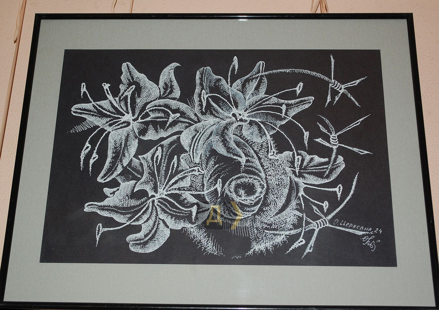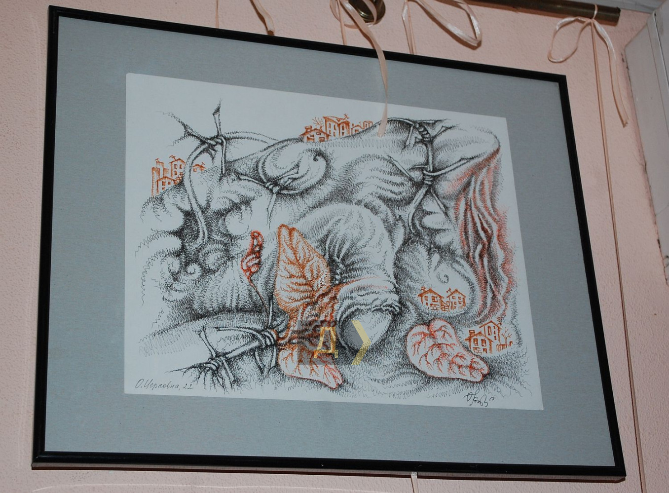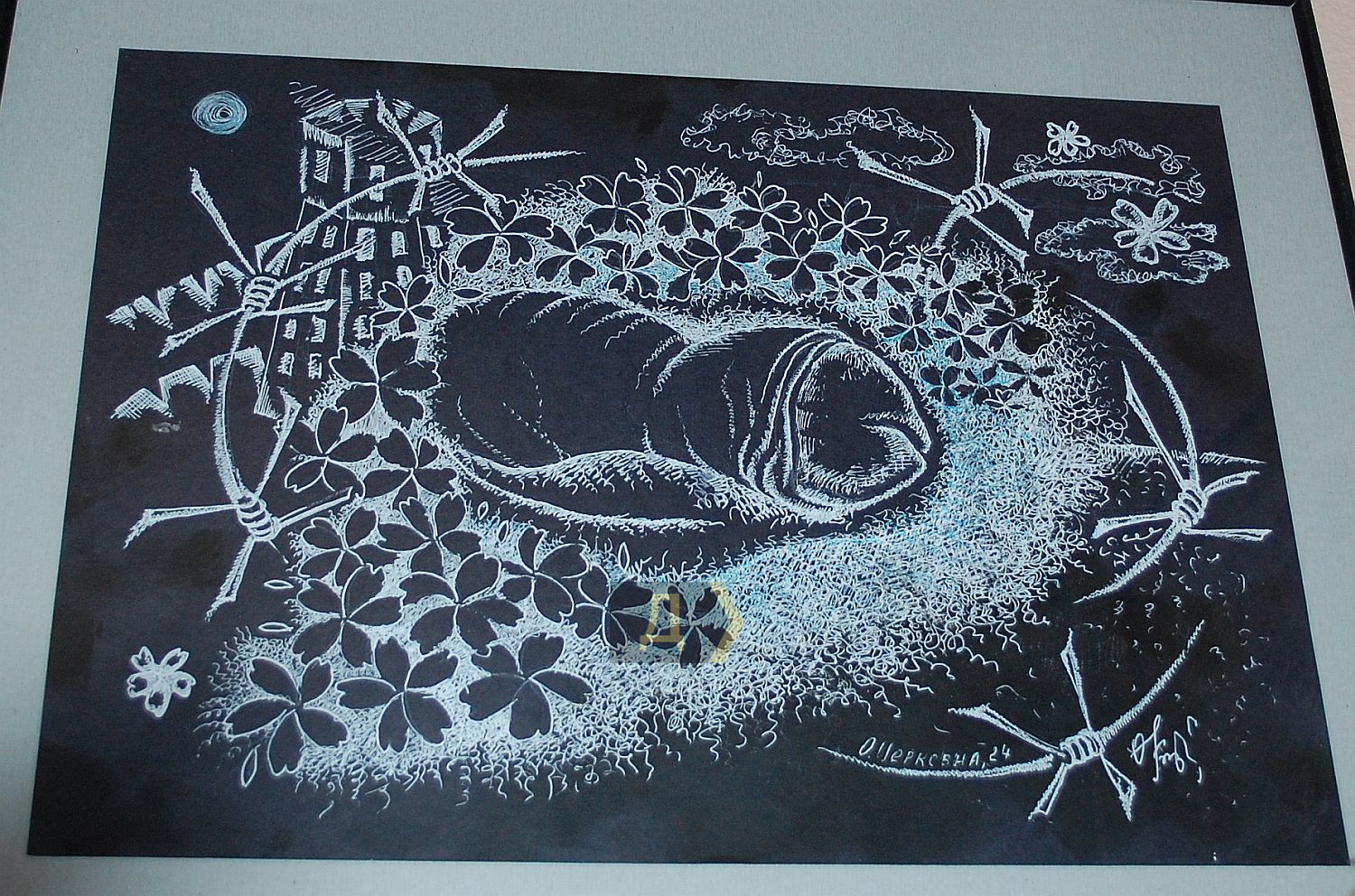 Тіло як ландшафт – метафора, що віддзеркалюється у творах через переплетіння природних форм і архітектури. Шрами нагадують про історичні події, а текстури підкреслюють життєві переживання. Тіло водночас особисте і колективне, інтимне і суспільне і несе в собі досвід, який можливо відчути на глибшому рівні». Інтимність – це завжди гра між відкриттям і закриттям, між допуском і захистом, нагадує мисткиня. Колючий дріт – метафора заборон, символ нав'язаного контролю над тілом, яке може прагнути розширення, контакту, але війна, травма чи суспільні норми тримають його в обмеженні. Прагнення дотику контрастує з фізичною дистанцією. А взагалі-то кожен глядач або глядачка побачать в цих малюнках щось своє. Авторка — Ірен Адлер, фото Володимира Андреєва