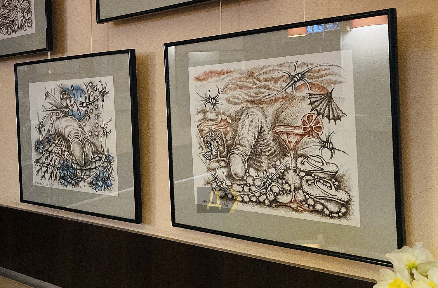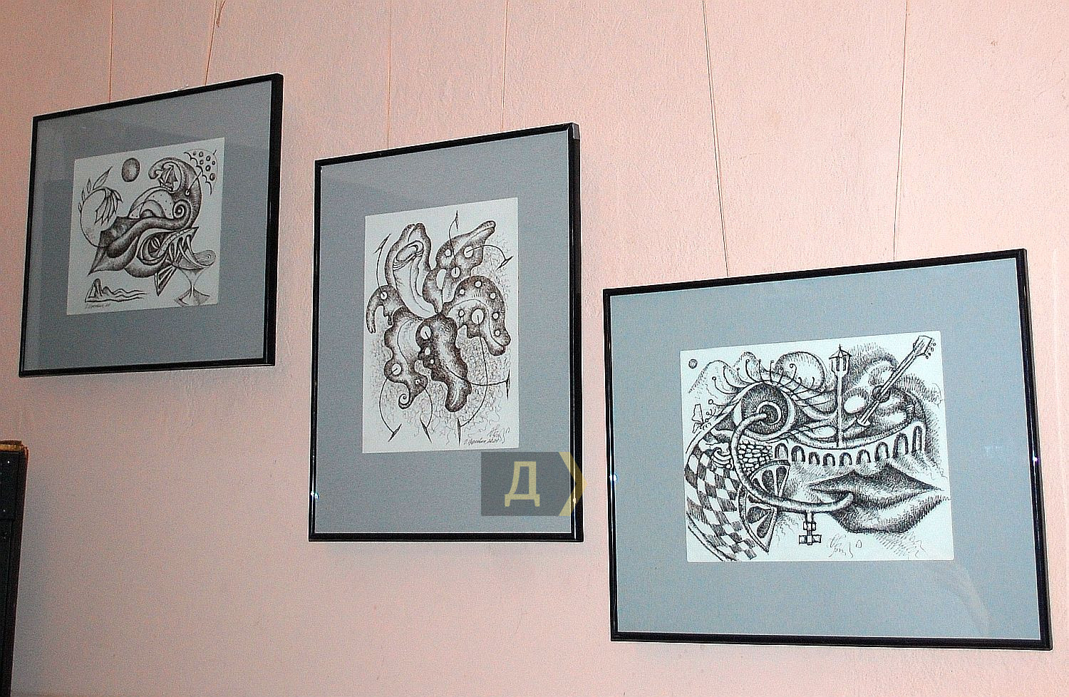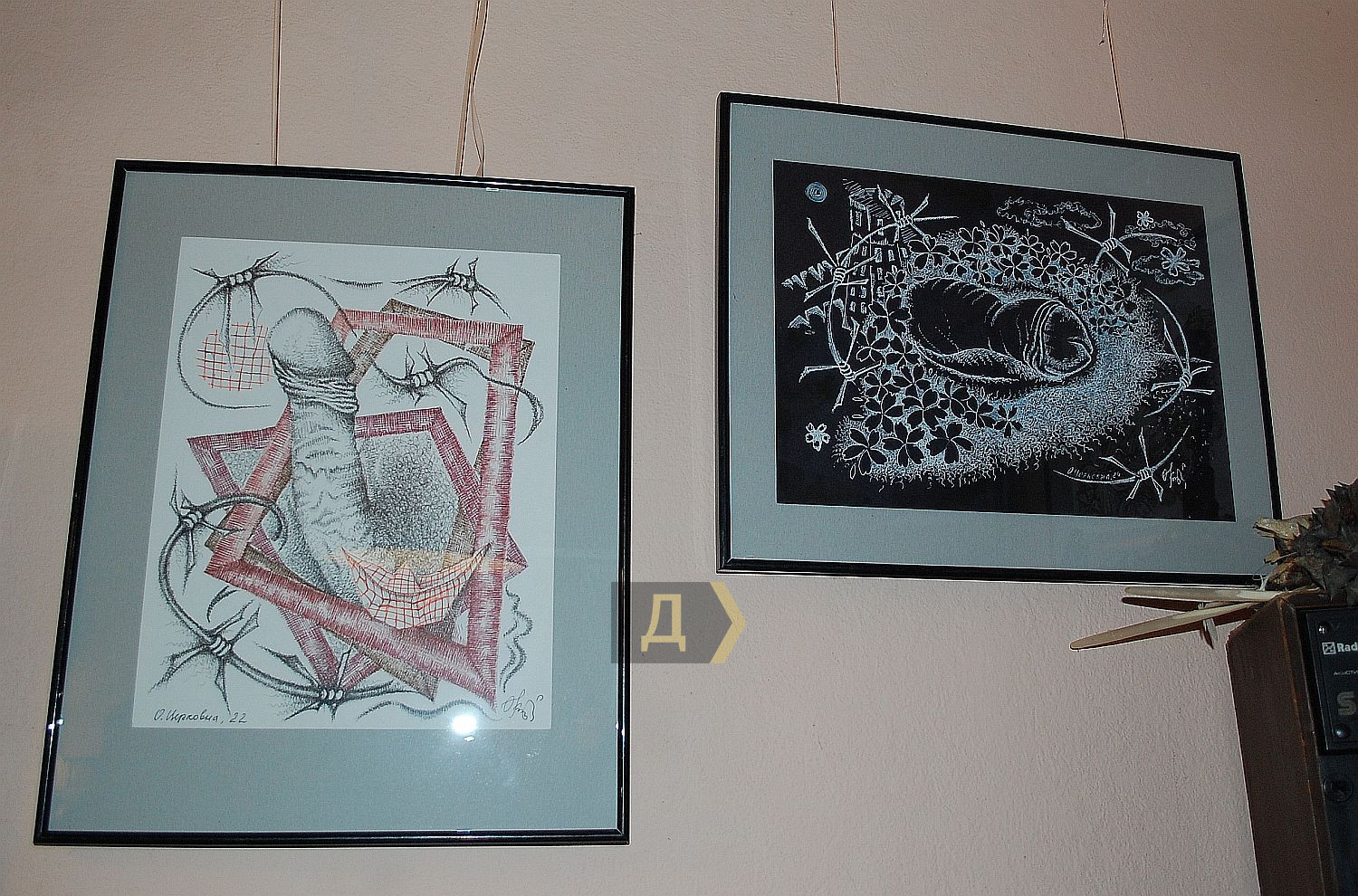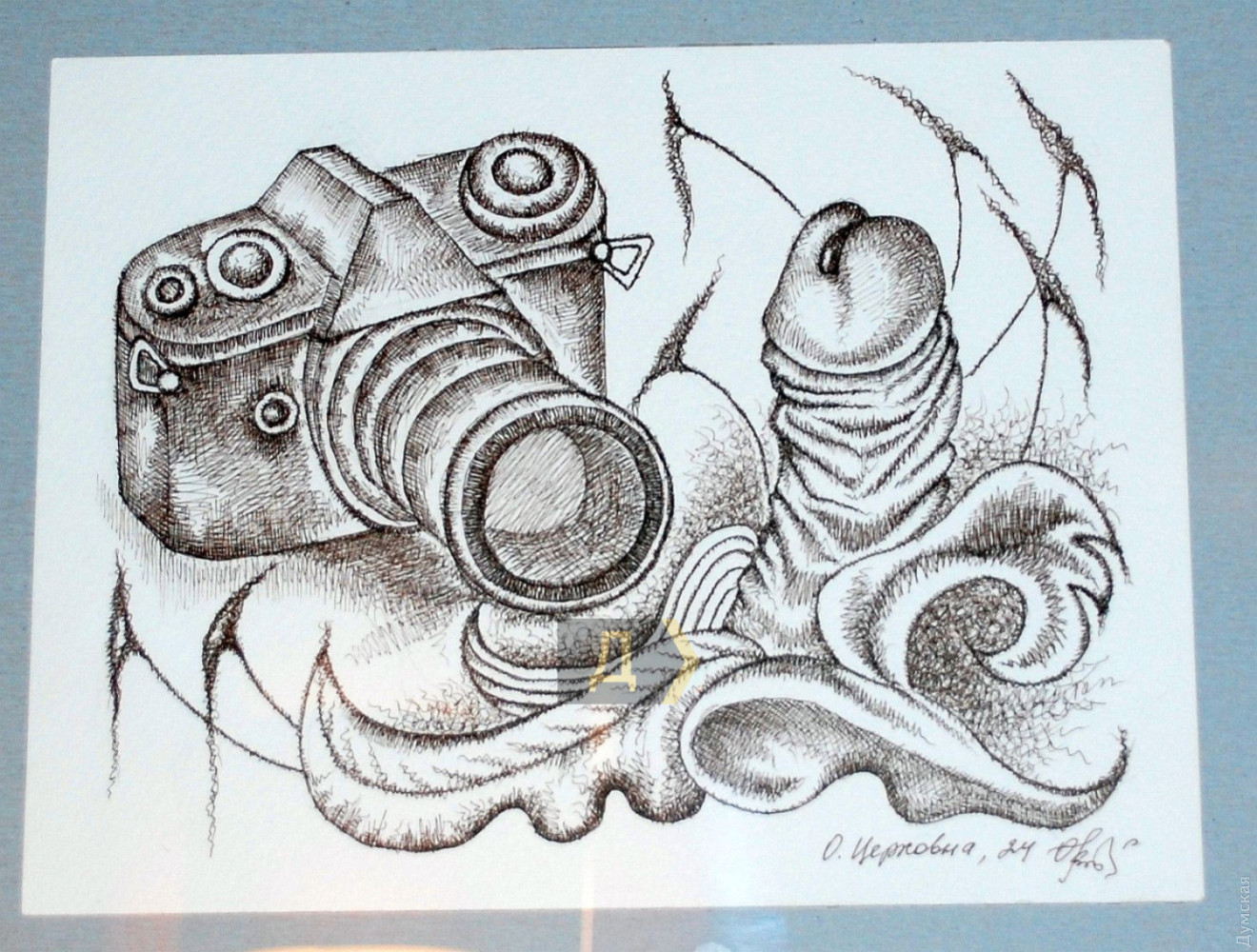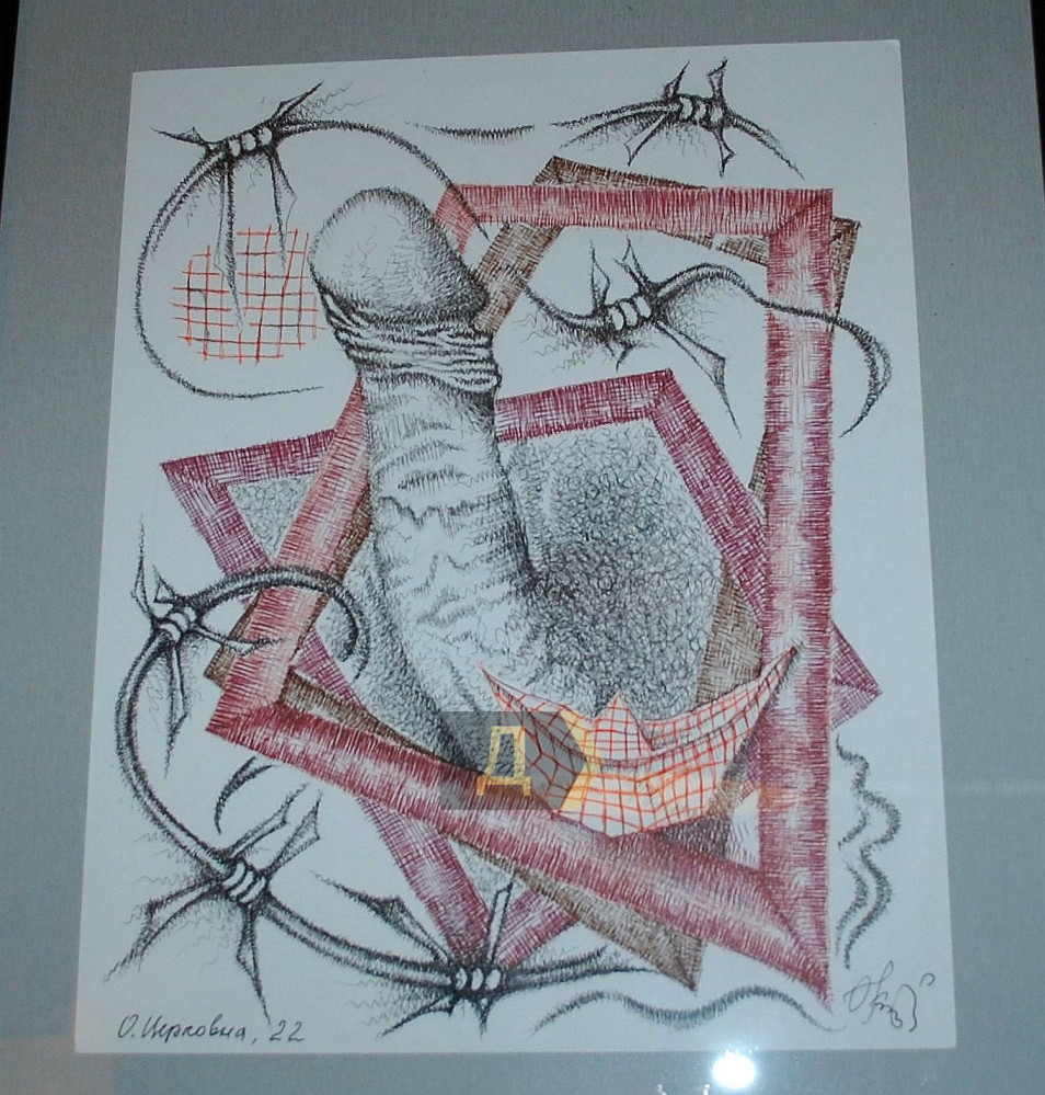 «Причудливые композиции, изображенные линерами на акварельной бумаге, содержат в центре именно фаллос, к тому же не в рабочем состоянии.»